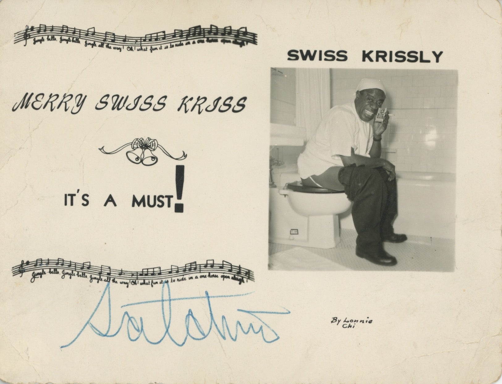 Original Christmas postcard photograph advertising Swiss Kriss laxatives, signed by the great jazz man as "Satchmo" and featuring a photograph of him on the toilet! The card reads "Merry Swiss Kriss / It's a Must!" and bears two lines of music from "Jingle Bells" alongside the halftone photograph. Armstrong has signed boldly as "Satchmo" in blue ink at the foot. Scalloped edges, with some corner creases. 4 x 6 inches.