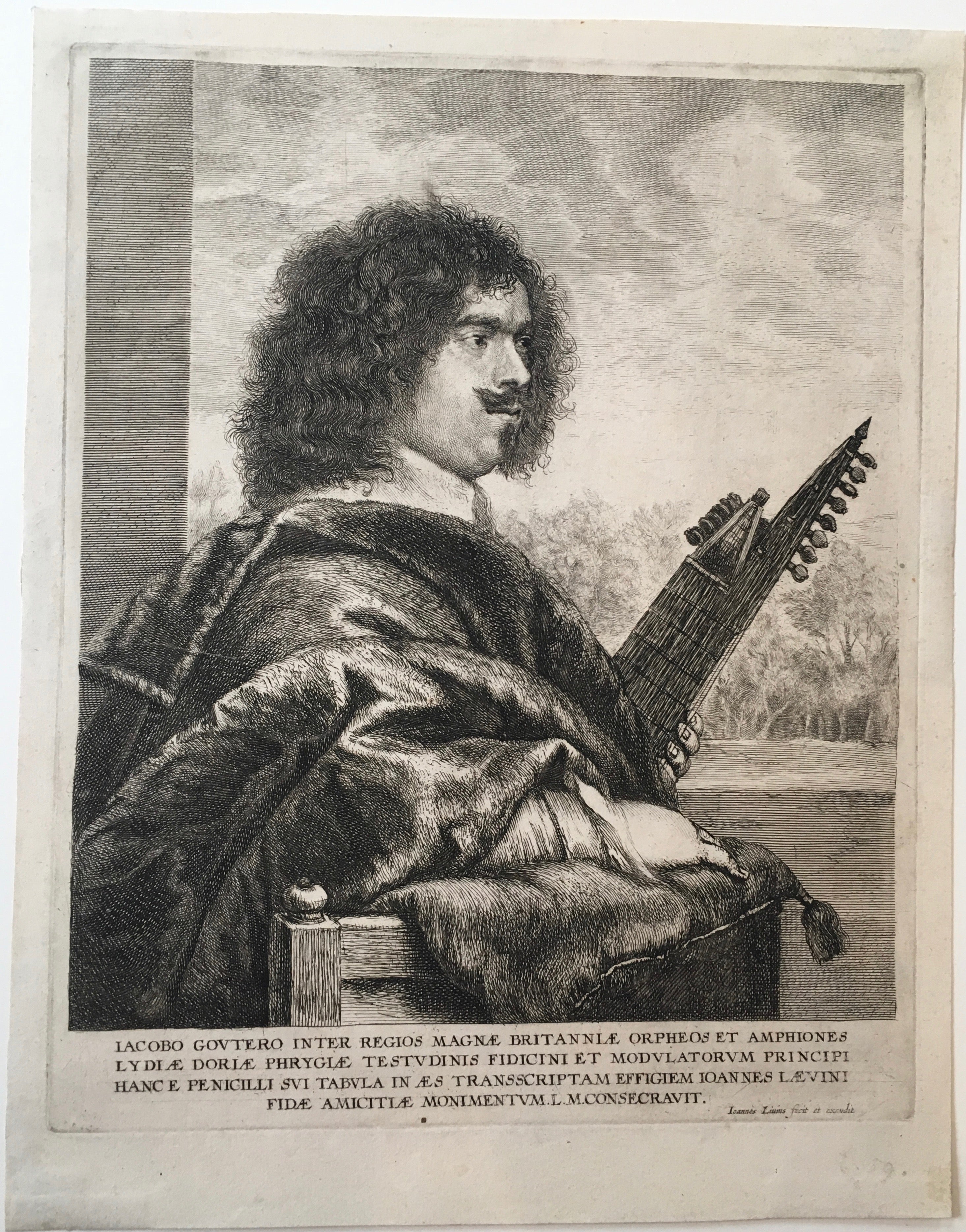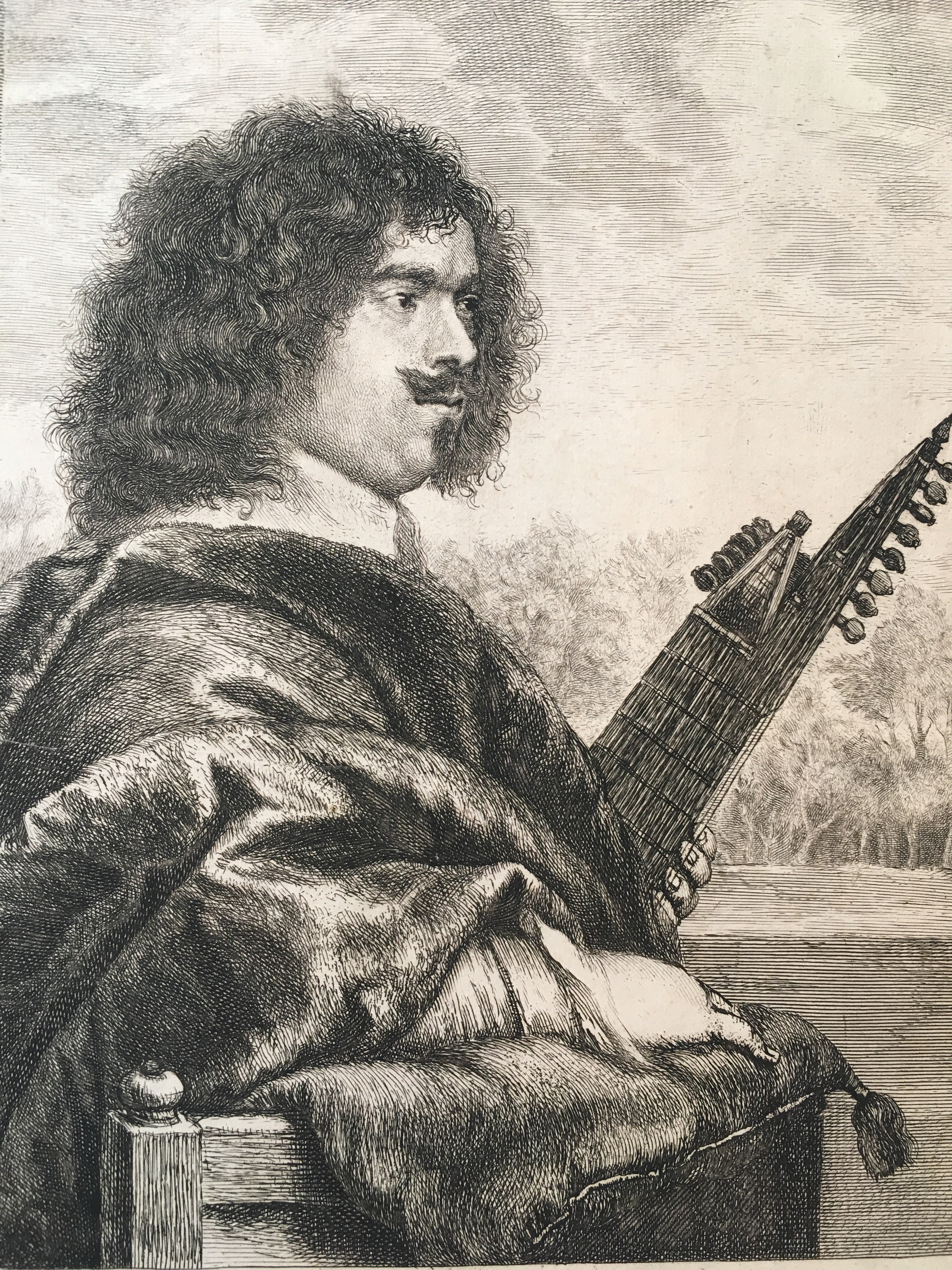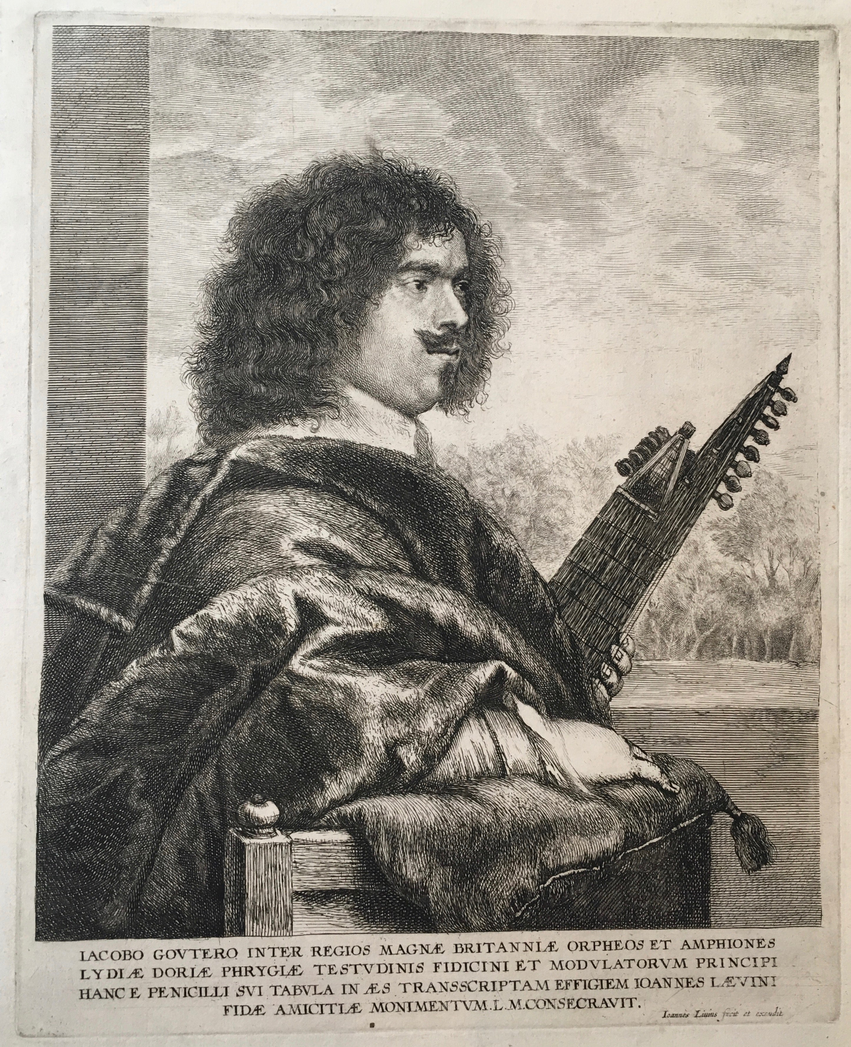 Gaultier was court lutenist in London from about 1617 to 1647. Lievens, after his roommate, Rembrandt, left Leyden to go to Amsterdam, fell under the influence of Van Dyck, and went to London for a time where he etched this now celebrated portrait.