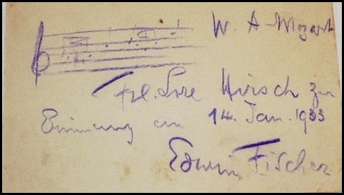 Fischer, Edwin. (1886-1960). Signed Photograph with Mozart AMQS.. Unusual autograph musical quotation, identified "W.A. Mozart," from the great Swiss pianist, the first to record Bach's Well-Tempered Klavier. Written in purple pencil, on the verso of a portrait postcard, dated 1933. A probing interpreter, Fischer wrote that "our aim should not be pure soil and sterile air in which nothing will grow."