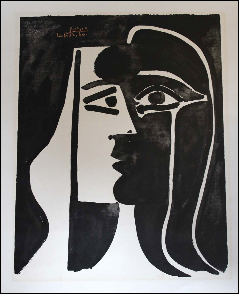[Visual Arts] Picasso, Pablo. (1881–1973). Tête de femme . Zervos vol. 19, plate 386. Dec. 1, l960, [actually done Nov. 12, 1960]. Signed within the print.
