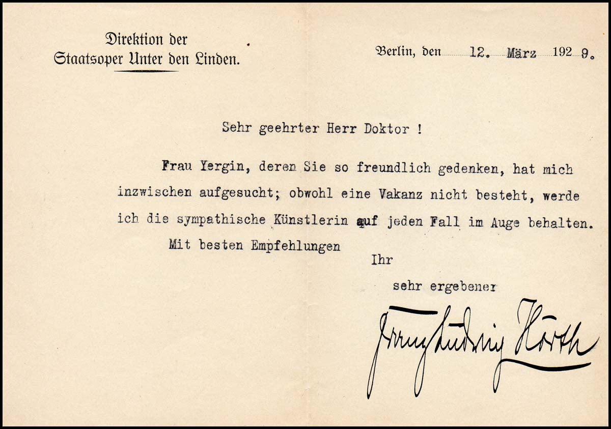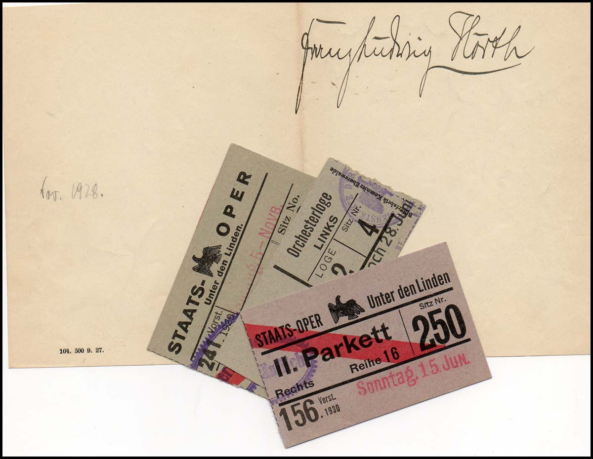 Grouping of signed and unsigned items from the stage director of the Staatsoper in Berlin, who directed the first performance of Berg's "Wozzeck" on 14 December, 1925. The grouping includes: a typed and signed note dated 12 March, 1929 on Staatsoper letterhead; an unsigned similar note dated 11 April, 1931; a grouping of opera tickets, various dates with a signed presentation from Horth; two program pages, each with a printed photograph of the conductor.