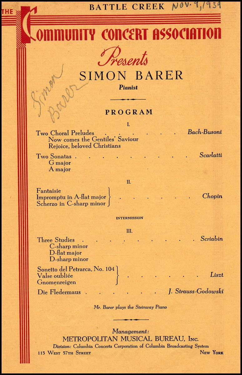 Barere, Simon. (1896 - 1951). Signed Program. Elusive signed program from the renowned Russian-born American virtuoso pianist, celebrated for his legendary speed and finger dexterity. On 2 April 1951, Barere suffered a cerebral hemorrhage during a performance of Grieg's Piano Concerto at Carnegie Hall, with Eugene Ormandy conducting the Philadelphia Orchestra. Barere subsequently collapsed and died backstage shortly thereafter.