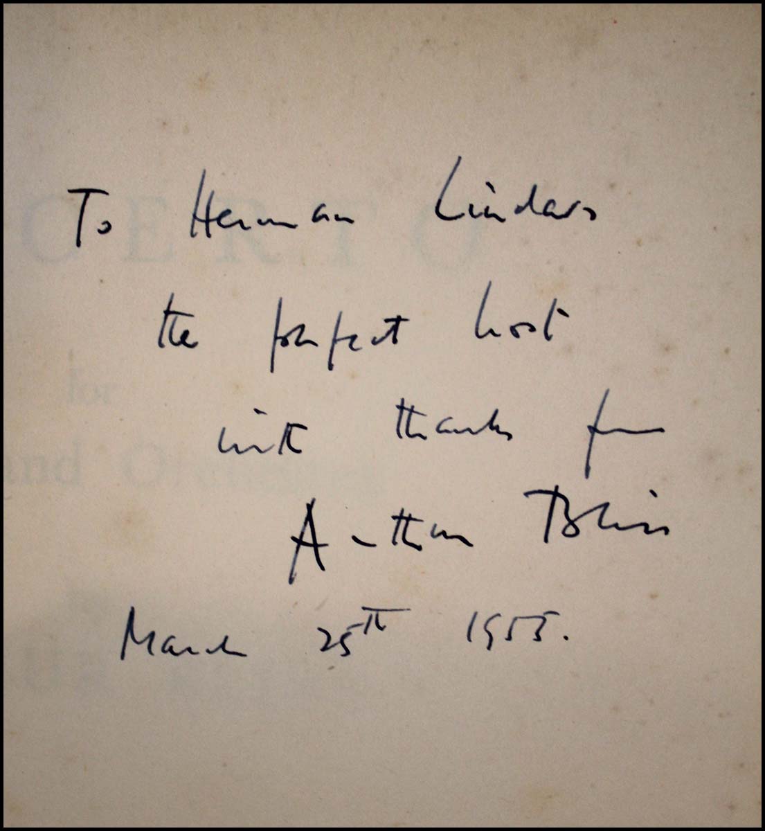 Bliss, Arthur. (1891 - 1975). Concerto for Piano and Orchestra - Signed Presenation Score. London: Novello. 1946. Miniature full score. 199 pp. [PN] 17104. Inscribed by the composer on the first free endpage: "To Herman Linder, the perfect host with thanks from Arthur Bliss / March 25th 1955." Printed blue wrappers, a little toned but otherwise fine throughout.