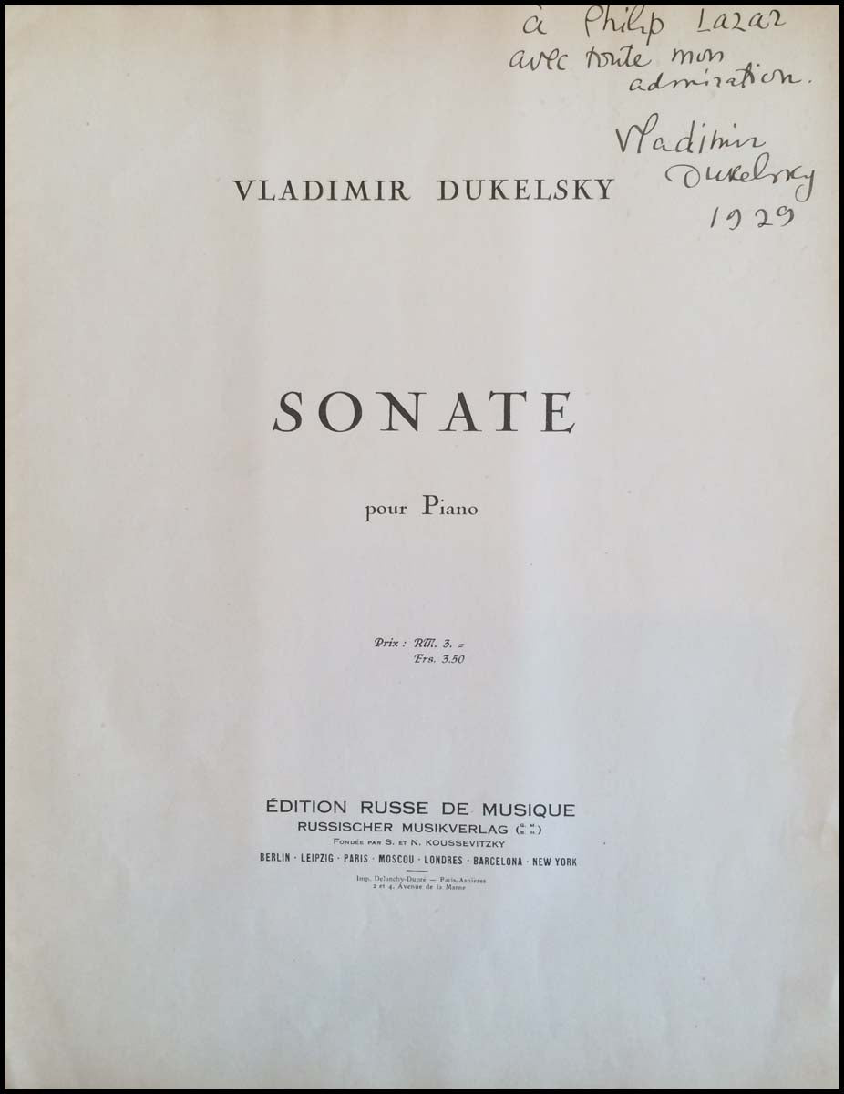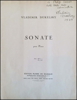 Upright folio, 18 pp. Scattered toning and handling stains on covers, internally fine. Signed and inscribed at the age of 26 on the title page to the Rumanian pianist, Philip Lazar. An uncommon early presentation copy from the important Russian-American composer who launched his career in Paris working with Diaghilev and Koussevitzky before rocketing into Broadway stardom under the name Vernon Duke and penning such tunes as "April in Paris" and "Autumn in New York."