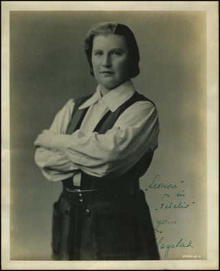 Flagstad, Kirsten. (1895–1962). Signed Photograph as Leonore. Glossy 8 x 10 inch photograph of the supreme Norwegian soprano standing in a three quarter length pose in costume as Leonore from Beethoven's opera Fidelio. Neatly signed in green fountain pen ink, also adding the name of the opera and her role in her hand. Some very small chips around the edges and stains on the verso, but overall a very fine example in an uncommon role photograph.