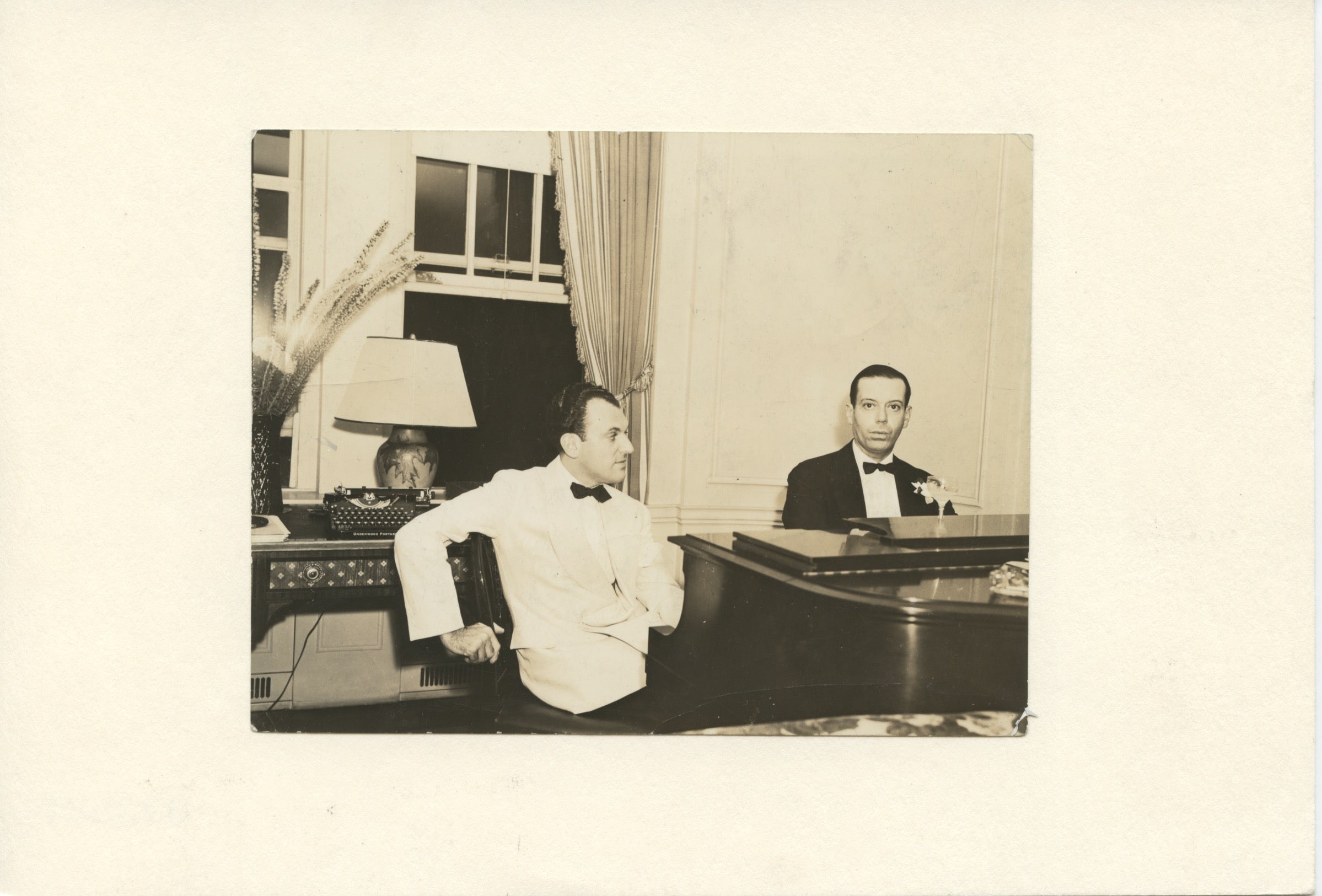 Porter, Cole. (1891–1964) & Hart, Moss. (1904–1961). Original Photograph, 1935.. Rare intimate photograph of the great composer/lyricist seated at the piano with the important playwright/director. 4.7 x 3.6 inches mounted to a slightly larger sheet, overall 5.5 x 7.92 inches (9.5 x 12 cm). Small creases, else fine.