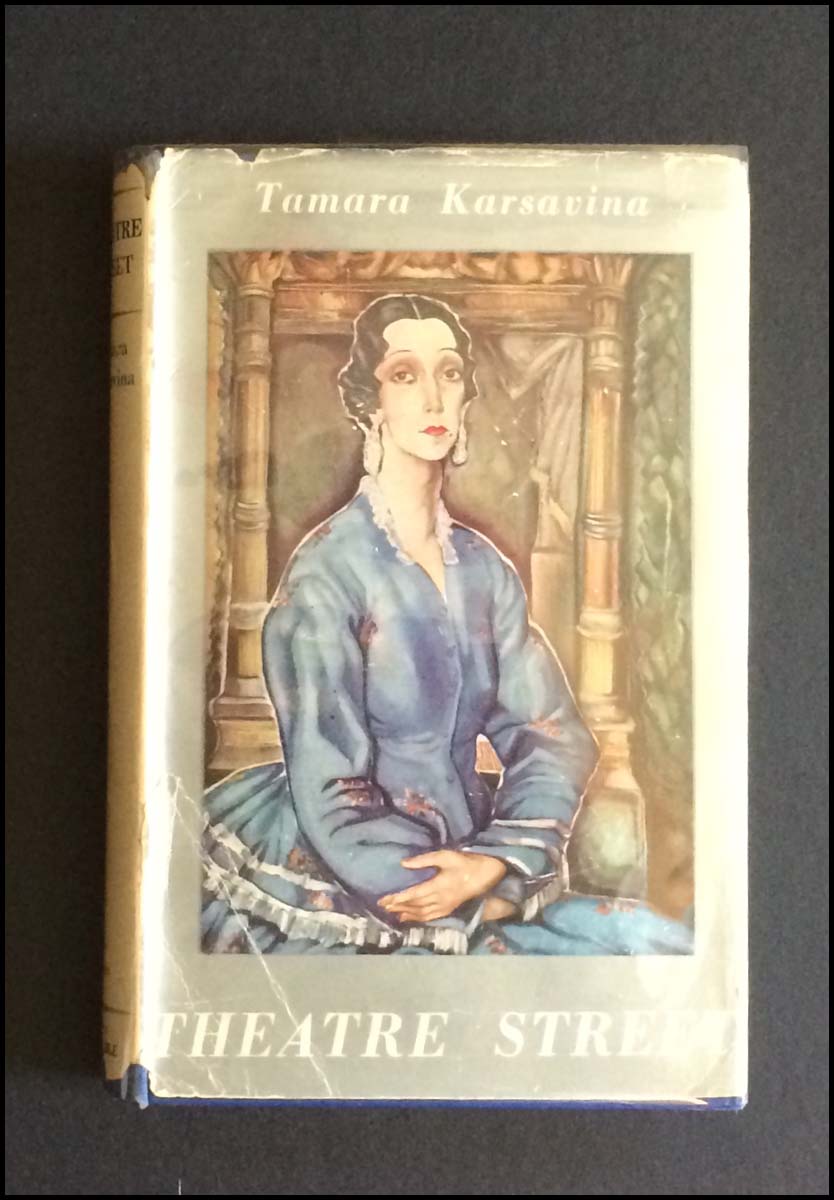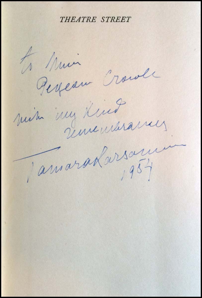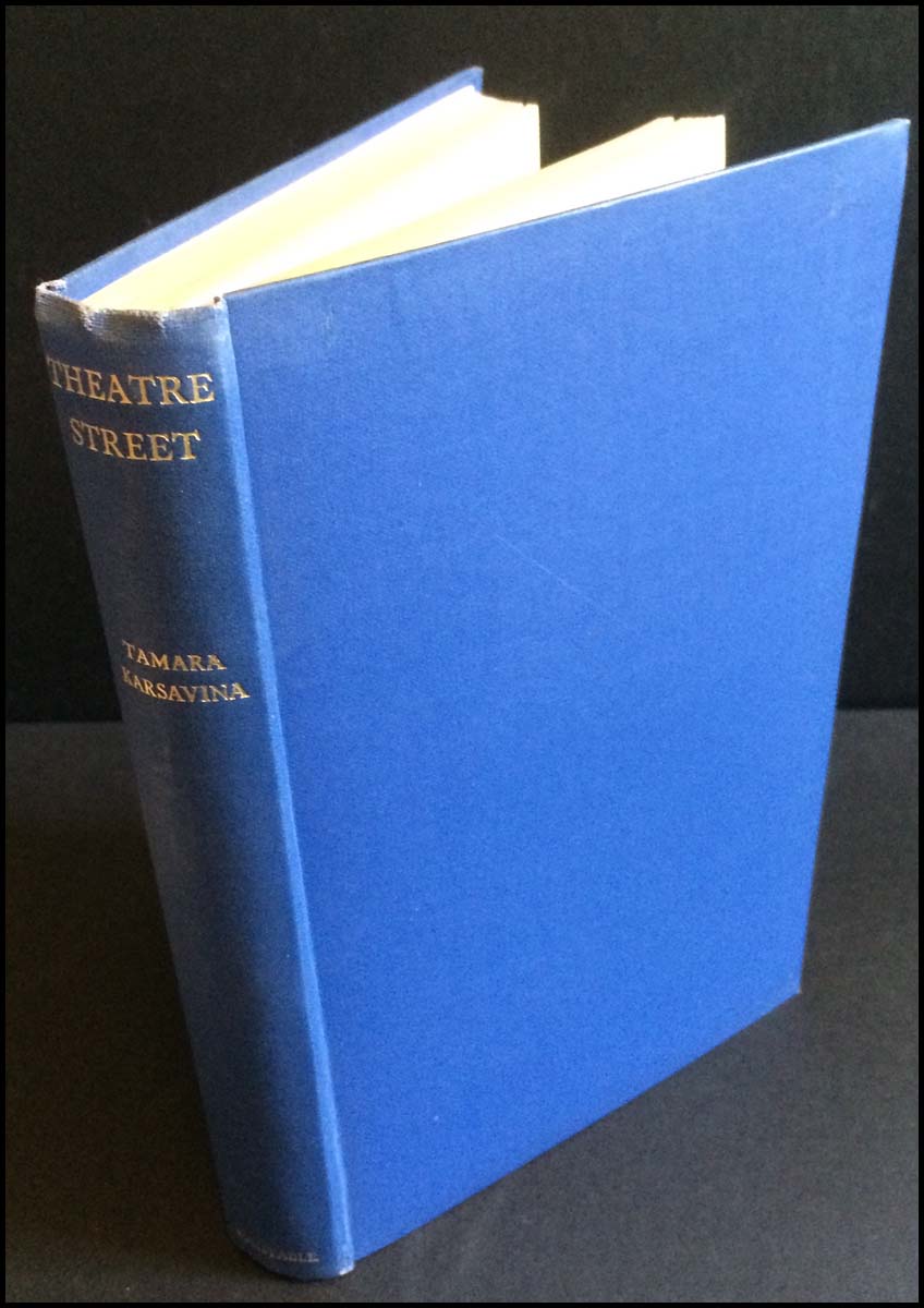 [Dance] Karsavina, Tamara. (1885–1978) [Danilova, Alexandra. (1903–1997)]. Theatre Street - INSCRIBED to Pigeon Crowle. London: Constable & Company. 1948. Revised and enlarged edition . Signed copy of the autobiography of Nijinsky's dance partner at the Ballets Russes, inscribed to the artist, sculptor, authoress and Ballet-composer, Pigeon Crowle (1903-1960), "with my kind remembrances, Tamara Karsavina, 1954." Bookplate of Pigeon Crowle to front pastedown and opposite, a second bookplate, of the balletomane Alexander Schouvaloff. 302 pp. Plain photographic illustrations, Blue cloth, front and rear inner seams separating but holding on, jacket rather worn, unclipped but with edgewear and loss to paper of spine and some repairs to jacket verso.