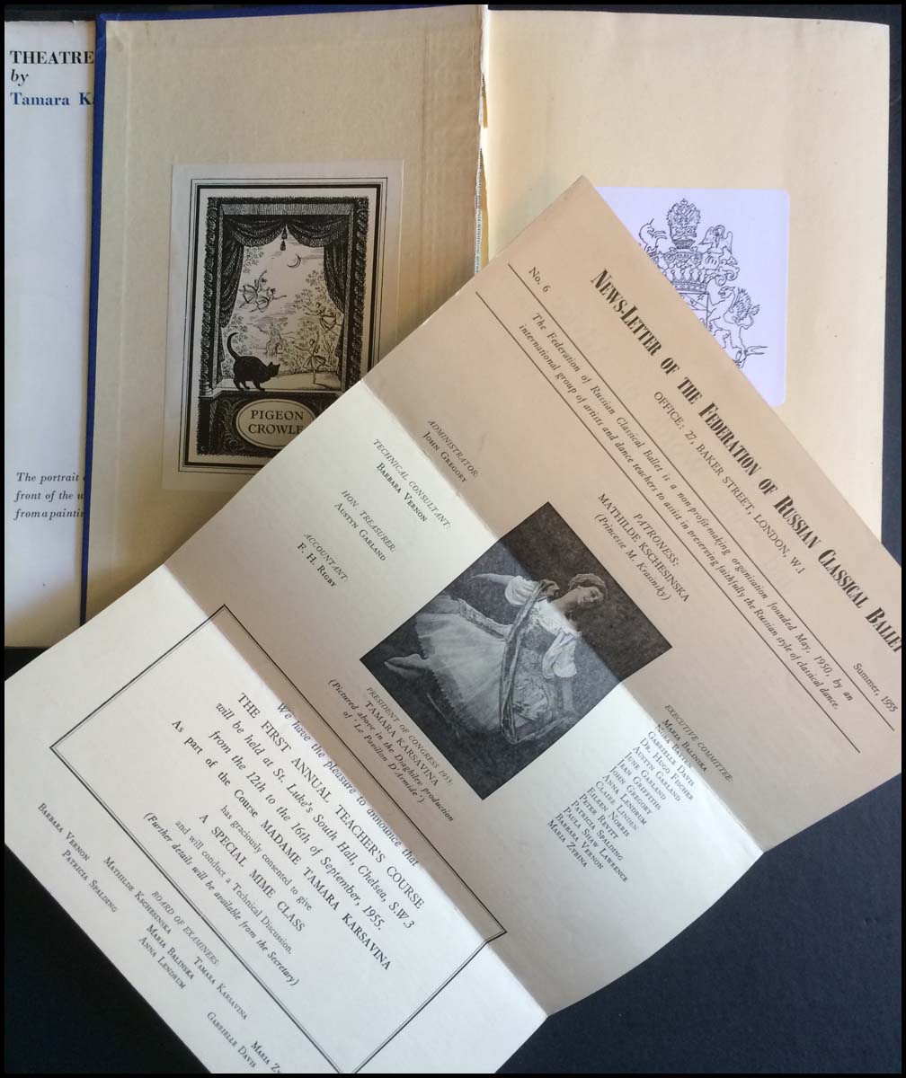 Karsavina's account of her early life at the Imperial Ballet School, and her subsequent career at the Marinsky Theatre and the Ballets Russes. The revised edition, with a new chapter on Diaghilev added. Sold together with a 1955 News-Letter of the Federation of Russian Classical Ballet, London flyer from an appearance by Karsavina giving a "Special Mime Class" at their First Annual Teacher's Course.