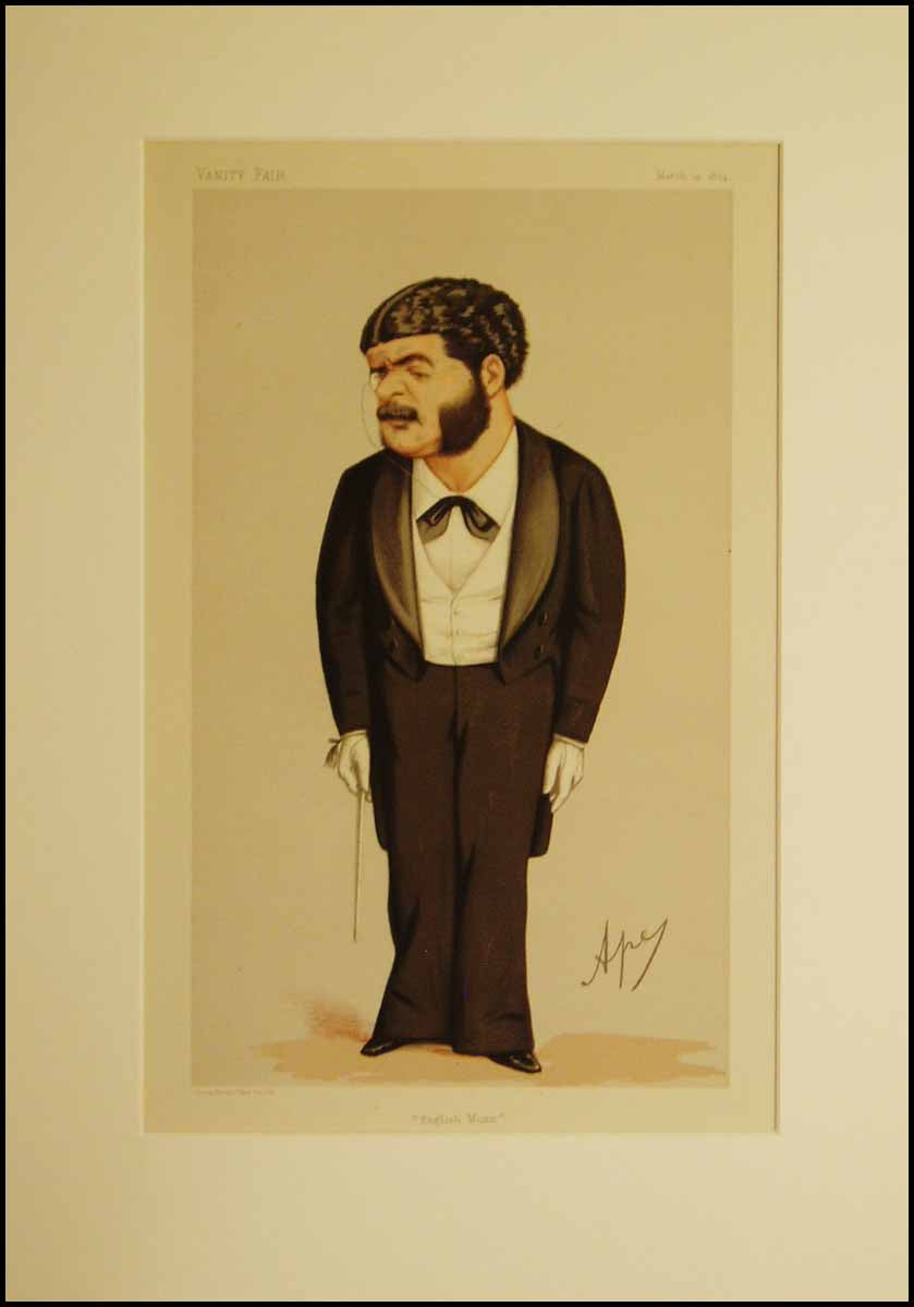 A spirited portrait of the British composer best known for his collaborations on more than a dozen classic comic operas with librettist W. S. Gilbert. A fine chromo-lithograph caricature published in the English weekly magazine Vanity Fair on March 14, 1874. The portrait is by Carlo Pellegrini, known as "Ape," one of the most famous of the outstanding caricaturists who published in the magazine. In excellent condition, 15 x 10.5 inches.