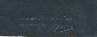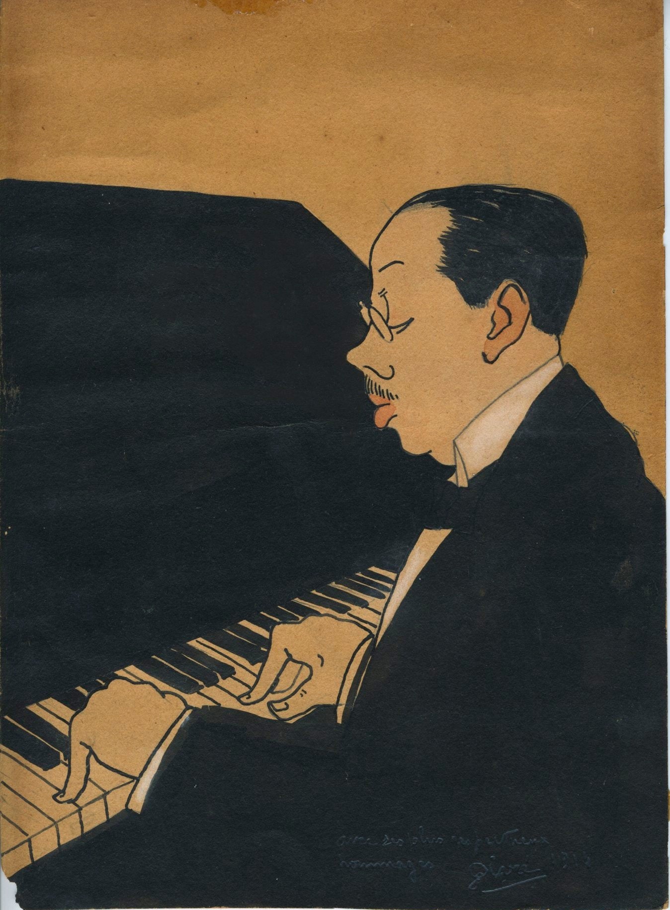 [Ballets Russes] Diaghilev, Sergei. (1872-1929). Original Portrait Painting. Evocative original French portrait in ink and gouache of the important ballet impresario and founder of the Ballets Russes, shown here seated at the keyboard. Signed and inscribed by the artist lower right in pencil "Avec ses plus respectueux hommage" and dated 1914. 24 x 17 cm.
