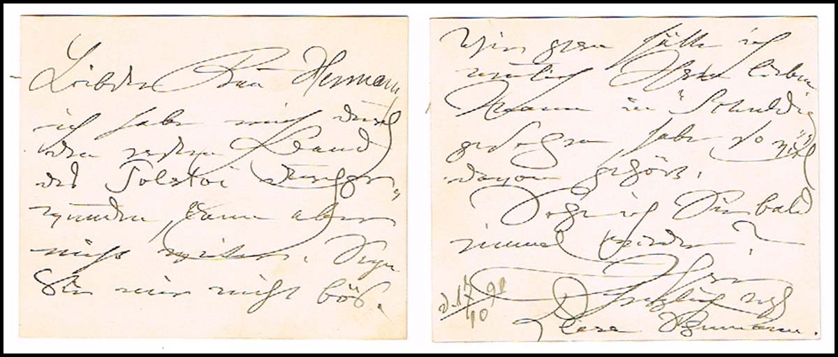 Autograph letter, signed "Clara Schumann". October 10, [18]91. 2 sides of a small card on which the illustrious pianist and composer writes to Frau Hermann, translated in full from the German: "My dearest Frau Hermann, I made it through the big Tolstoi tome but no further. Please don’t be angry with me. I would have loved to see your husband in “Schuldig,” having heard so much about it. Will we meet again soon? Warmest regards, Clara Schumann." In fine condition.