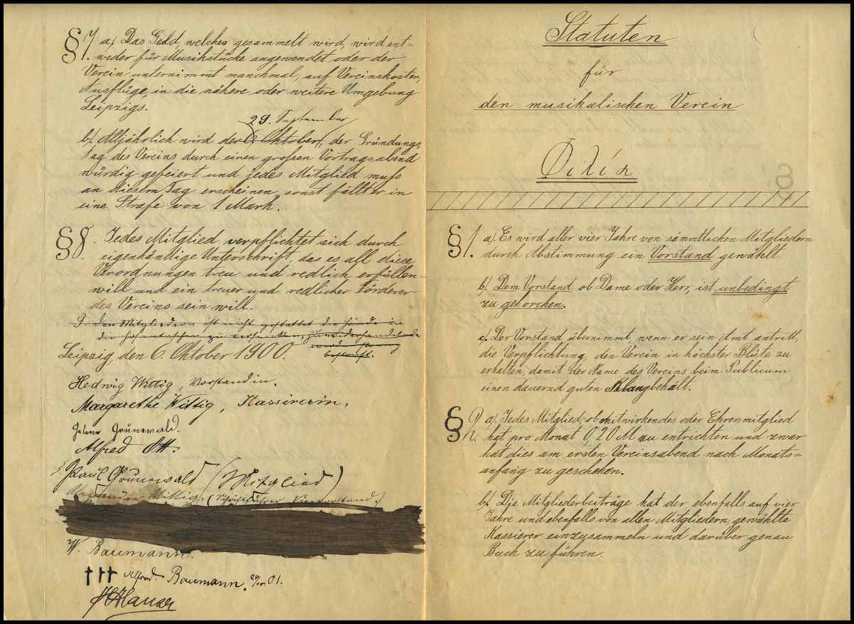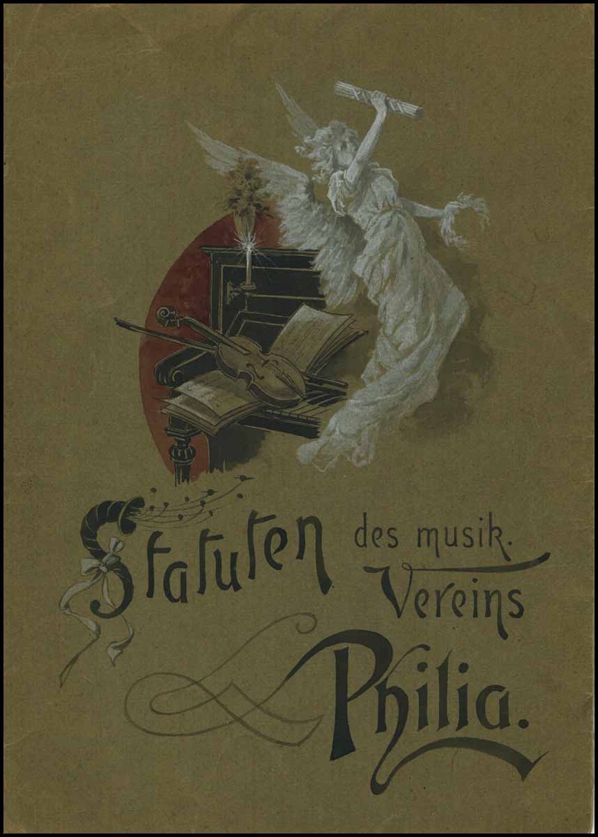 Founded in 1880, the "Philia" choir is one of the oldest choirs in Stuttgart. The present autograph manuscript, 4 pp, is contained in a very attractive hand-painted decorative folder, featuring an illustration of a keyboard, violin and an angel. The statute itself which includes such rules as "no member make make an offensive joke, but rather must always be in a good and happy mood and bring as much happiness as possible to the group," is signed by nine members at the conclusion.