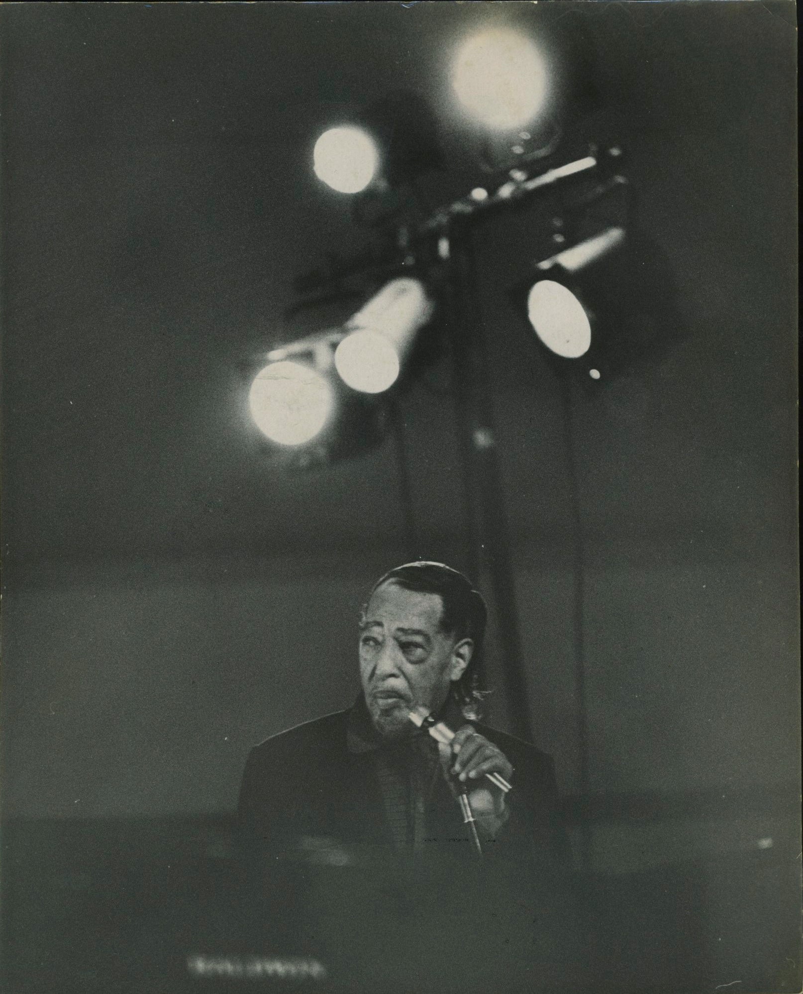 Striking original 1974 photograph by Dave Harneld of Memphis of the important American jazz composer, bandleader and pianist, shown with microphone in hand at the keyboard under strong illuminating lights. Stamped by the photographer on the verso. Annotations and stickers on verso which is also heavily toned, else fine. 8 x 10 inches (20 x 25 cm).