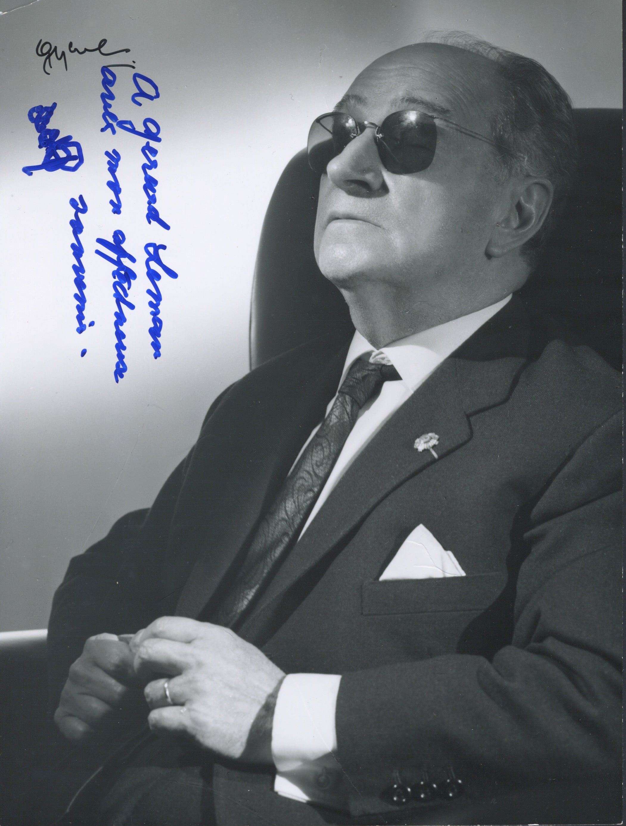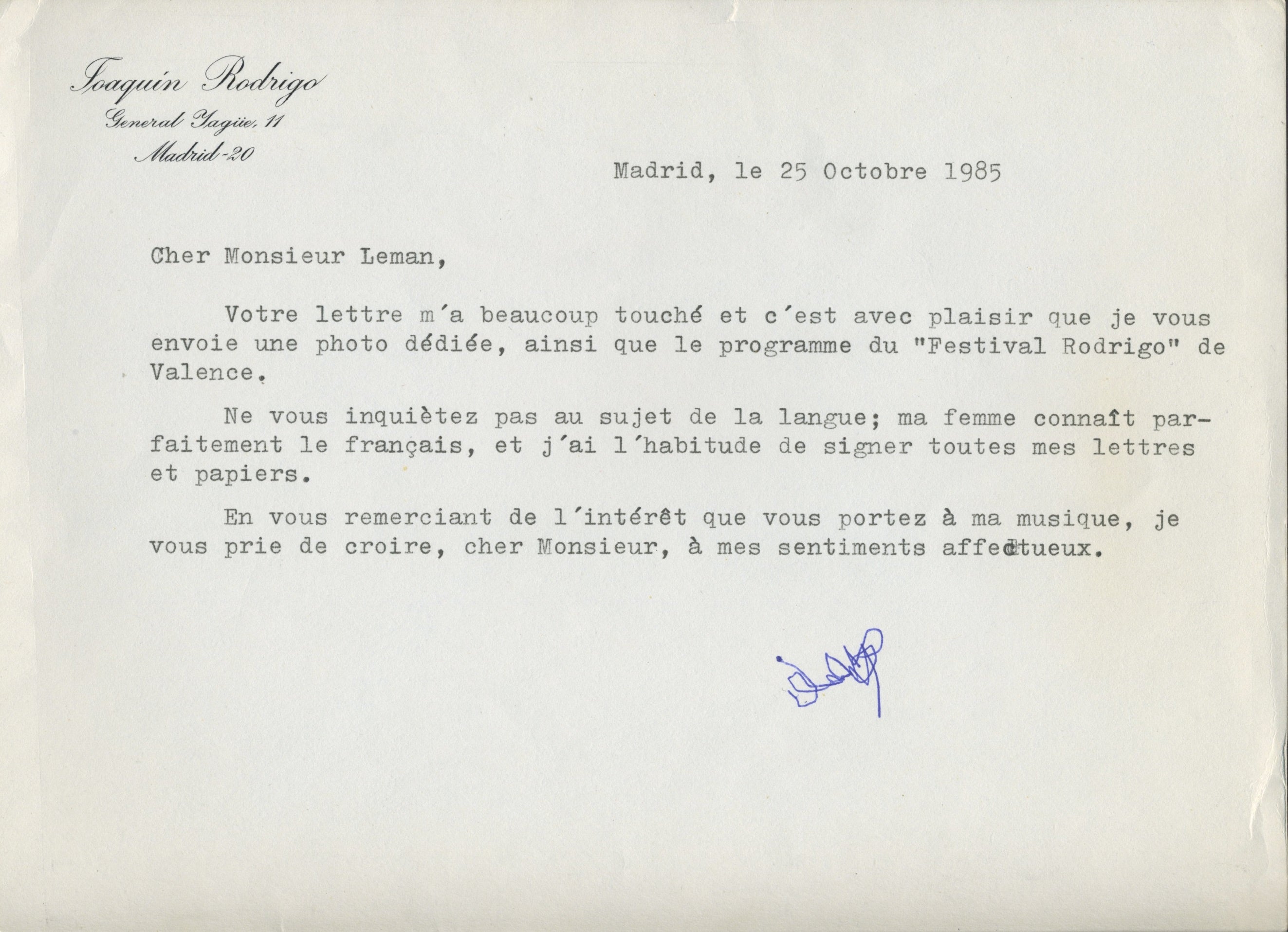 Rare signed photograph of one of the most significant Spanish composers of the twentieth century. Inscribed in the hand of the composer's wife and amanuensis, the pianist Victoria Kamhi de Rodrigo (1905–1997), and signed by the blind composer himself beneath. Together with a typed letter signed (October 25, 1985, 1 p.) sending the photograph. Translated from the French, in part: "Dear Mr. Leman, Your letter touched me greatly and it is with pleasure that I send you a signed photograph, as well as the program from the 'Festival Rodrigo' in Valence. Don't worry about the language; my wife knows French perfectly and I am accustomed to signing all my letters and papers..." Together with an original envelope addressed to Gerard Leman and postmarked 1988. Some light edge and surface wear to the photograph; overall fine. Photograph 7 x 9.25 inches (17.8 x 23.6 cm), letter 8.75 x 6.5 inches (22.5 x 16.4 cm).