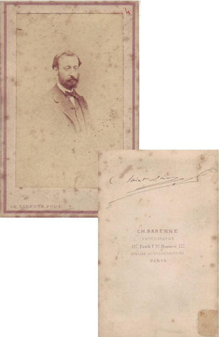 Early bust-length cabinet photograph, ca. 1870, of the influential French composer in formal dress, signed with his name alone "C. Saint-Saens" on the verso. Spotting over the image and verso, otherwise in good condition. The image by Barenne of Paris, 10.5 x 15 cm. From the Gavy-Bélédin collection, once part of the 'bibliothèque municipale de Nantes' (see stamp, lower right) later returned to the family and sold at auction. Signed photographs from this period are very scarce.