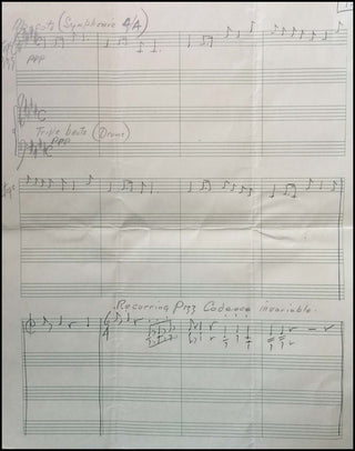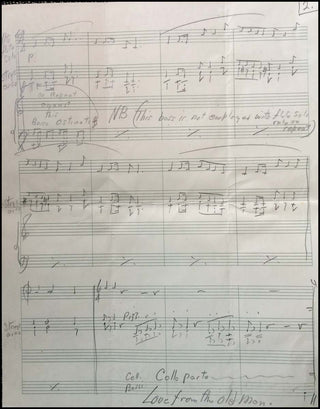 Kern, Jerome. (1885–1945). Autograph Musical Manuscript. Autograph manuscript of a previously unknown composition, from the estate of the important American clarinetist and bandleader, Artie Shaw. Complete in 2 pp., folio, for strings and alto flute, accomplished in pencil entirely in Kern's hand and inscribed at the conclusion "Love from the old man." Originally obtained directly from the Estate of Artie Shaw, sold with a certificate from the Estate.
