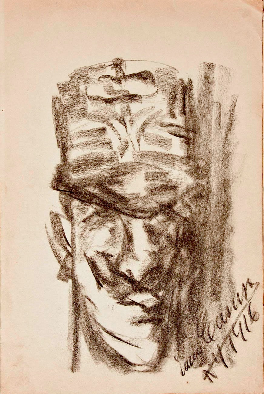 Large original charcoal drawing by the great tenor, signed "Enrico Caruso / NY 1916," a bust portrait of the King of Italy (1900 - 1946), nicknamed "Re soldato" (Soldier King) and "Re Vittorioso" (Victorious King), after Italy was victorious in the First World War (during which the present drawing was accomplished). A similar portrait can be seen in the "Rulers of World" section of Caruso's published volume of Caricatures (NY: La Follia, 1939). 25 x 38 cm [10 x 15 inches]. Upper edge of sheet with a few small tears, otherwise fine.