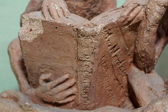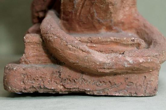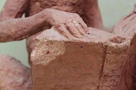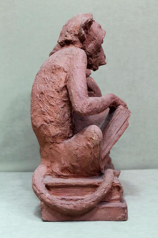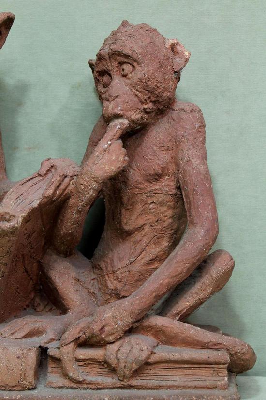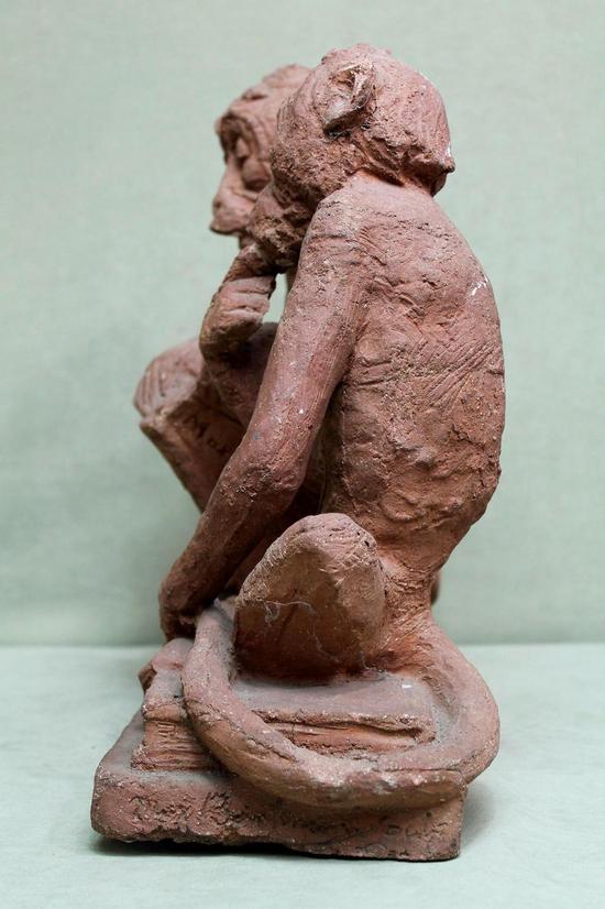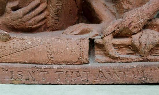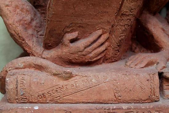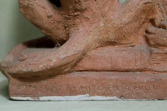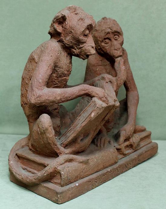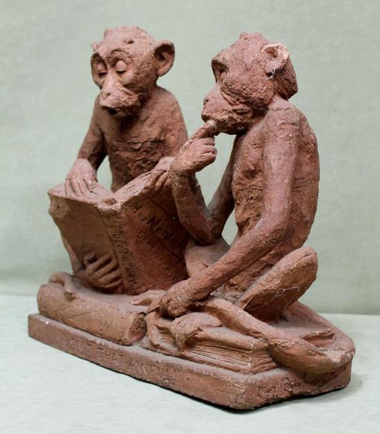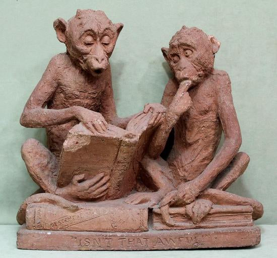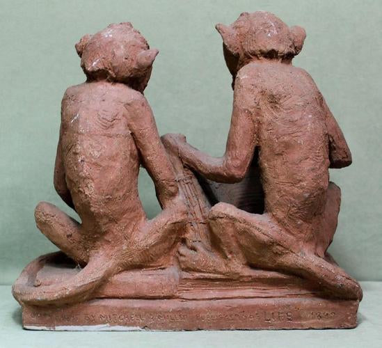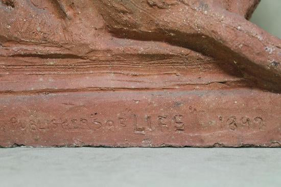 [Historical Americana] [Evolution or Degeneration] Bachmann, Max. (1862–1921). "Isn't That Awful" - 1897 Terracotta Sculpture for LIFE Magazine. Unique hand sculpted terracotta sculpture of two monkeys, measuring 16 x 14 x 13 inches, titled along the front edge of the base "Isn't That Awful," incised on the rear base "Copyright by Mitchell & Miller Publishers of LIFE 1897," and signed on the side of the base "Max Bachmann Sclpt." The monkeys are sitting on books and the one on the left, atop Darwin's "Descent of Man," is reading Max Nordau's "Degeneration." In very good condition, with chips to one book corner and to the ear of the monkey on the right. Apparently accomplished and intended for reproduction in an 1897 issue of LIFE magazine, founded in 1883 and at the time, the foremost American humor magazine of the period.