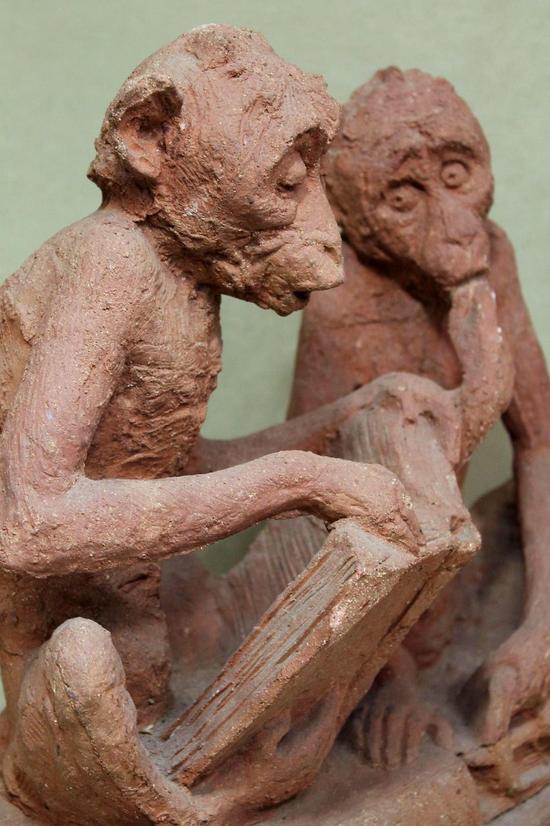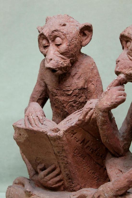Nordau's "Degeneration" (Entartung, 1892), is an attack on so-called degenerate art, though he condemns the rising Anti-Semitism of the late 19th Century as a product of degeneration and his viewpoints are more aligned with a sort of 18th-century belief in Reason, Progress, and more traditional, classical rules governing art and literature. His book deals with numerous case studies of various artists, writers and thinkers (Wilde, Ibsen, Wagner and Nietzsche to name but a few) but its basic premise is that society and human beings themselves are degenerating, and this degeneration is both reflected in and influenced by art. The present monkeys, literally propped up by Darwin's more hopeful 1872 "The Descent of Man," seem amused on behalf of the human race, which despite every apparent advantage of evolution, are now apparently sliding backwards...to their lowly station.