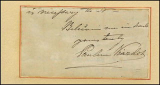 Viardot, Pauline. (1821-1910). Autograph Signature and Salutation. Clipped conclusion of a letter from the great singer, "Believe me in haste / yours truly / Pauline Viardot." 11 x 6 cm, mounted to a slightly larger card.