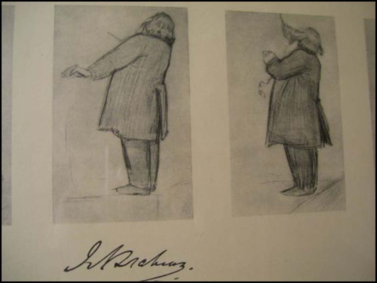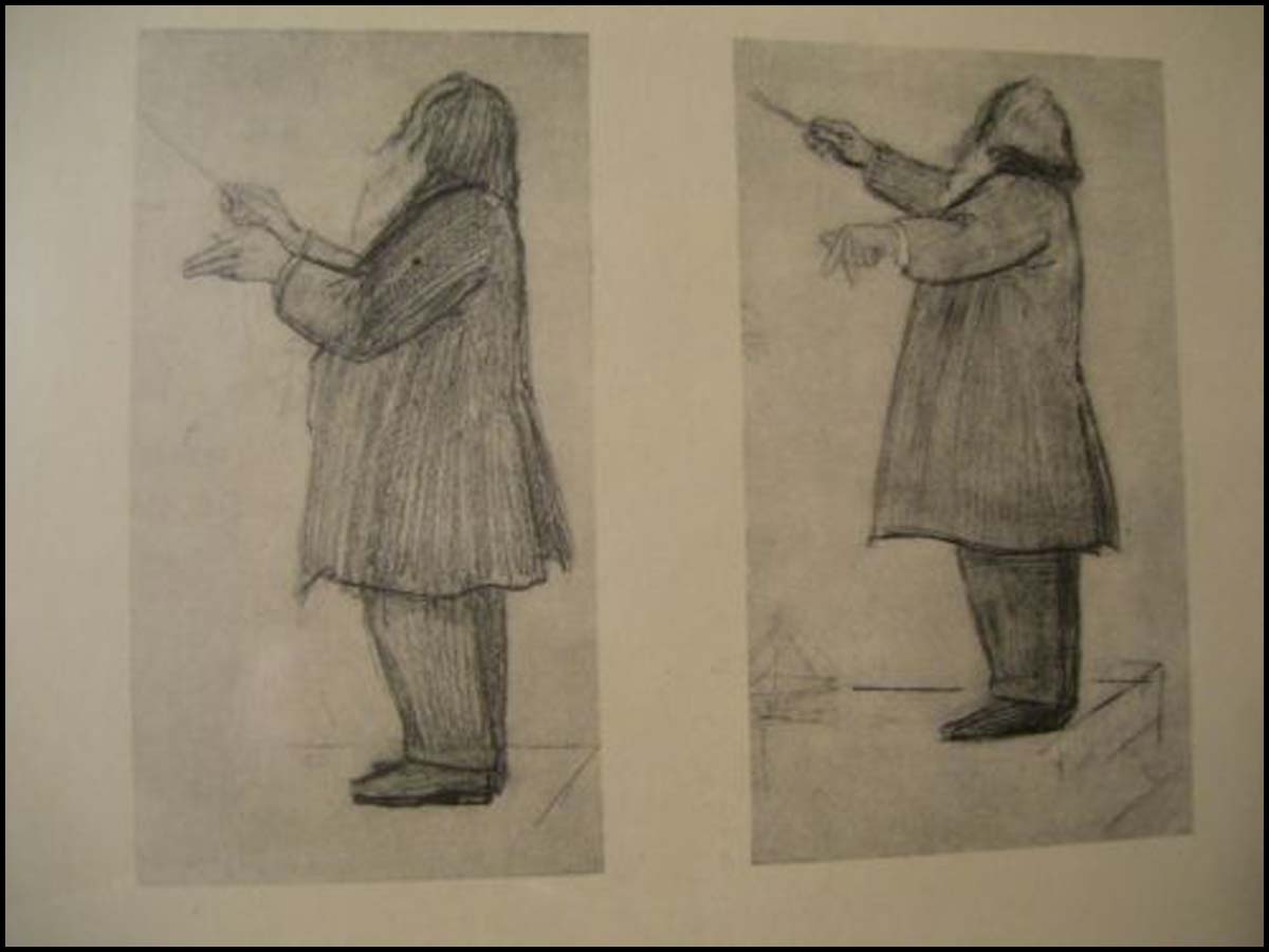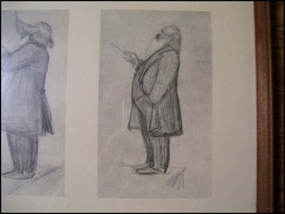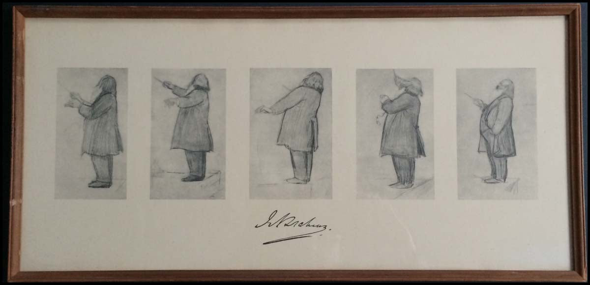 Brahms, Johannes. (1833–1897) [Beckerath, Willy von. (1868–1938)]. Brahms Conducting. Framed print, ca. 1920, after Willy von Beckerath's series of five drawings, 1894, showing the composer in various states of conducting a performance. Facsimile autograph of the composer in the lower margin. In a simple wood frame, in very good condition. 20 x 9.5 inches.