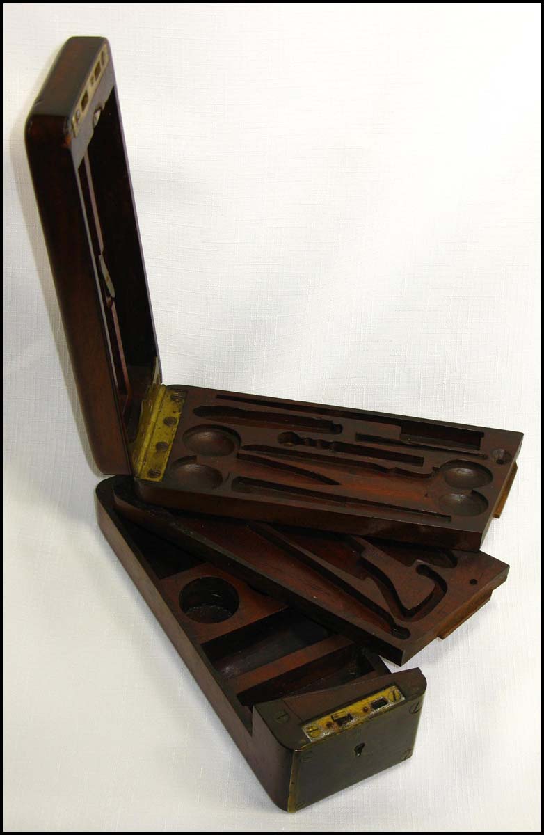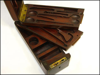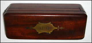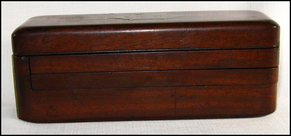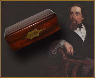 [Literature & Art] [Dickens, Charles. (1812 - 1870)] . Charles Dickens’ “Nécessaire de Voyage” box taken with him on his travels. Walnut “Nécessaire de Voyage” box, 8.5” x 3” x 3”, with keyhole. The hinged cover at left lifts to reveal two layers of swiveling lids, each section intricately carved out to accommodate various items (none are present) such as toothbrush, tweezers, scissors (2), penknife, cut throat razors, shaving soap, book hook, clothes & hair brushes, and manicure items. This box accompanied Dickens on his reading tours outside London.