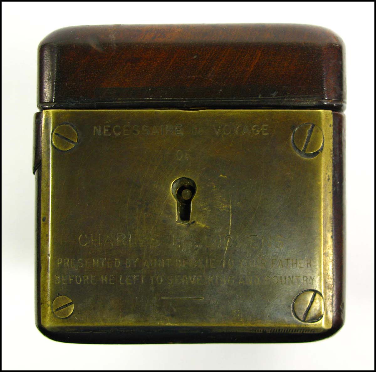 The lid is inset with an ornately shaped brass plate engraved “C.D.” A plaque on the front of the case, with patina, is engraved “Nécessaire de Voyage / of / [keyhole] / CHARLES J.H. DICKENS / presented by Aunt Bessie to your father / before he left to serve King and Country.”