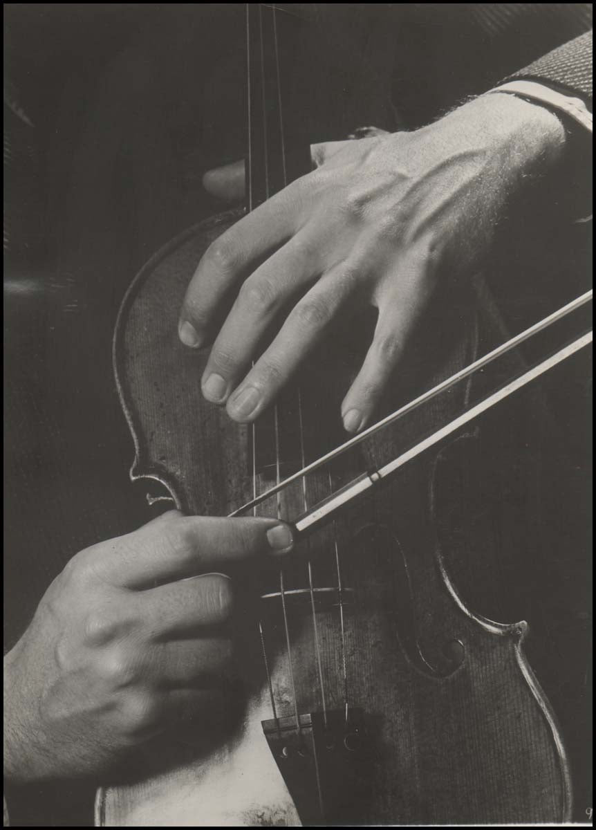 Attractive pair of 1938 closeup photographs of the violinist's hands. Each roughly trimmed to 9.5 x 7.5 inches, stamps on the verso, but overall in very good condition.