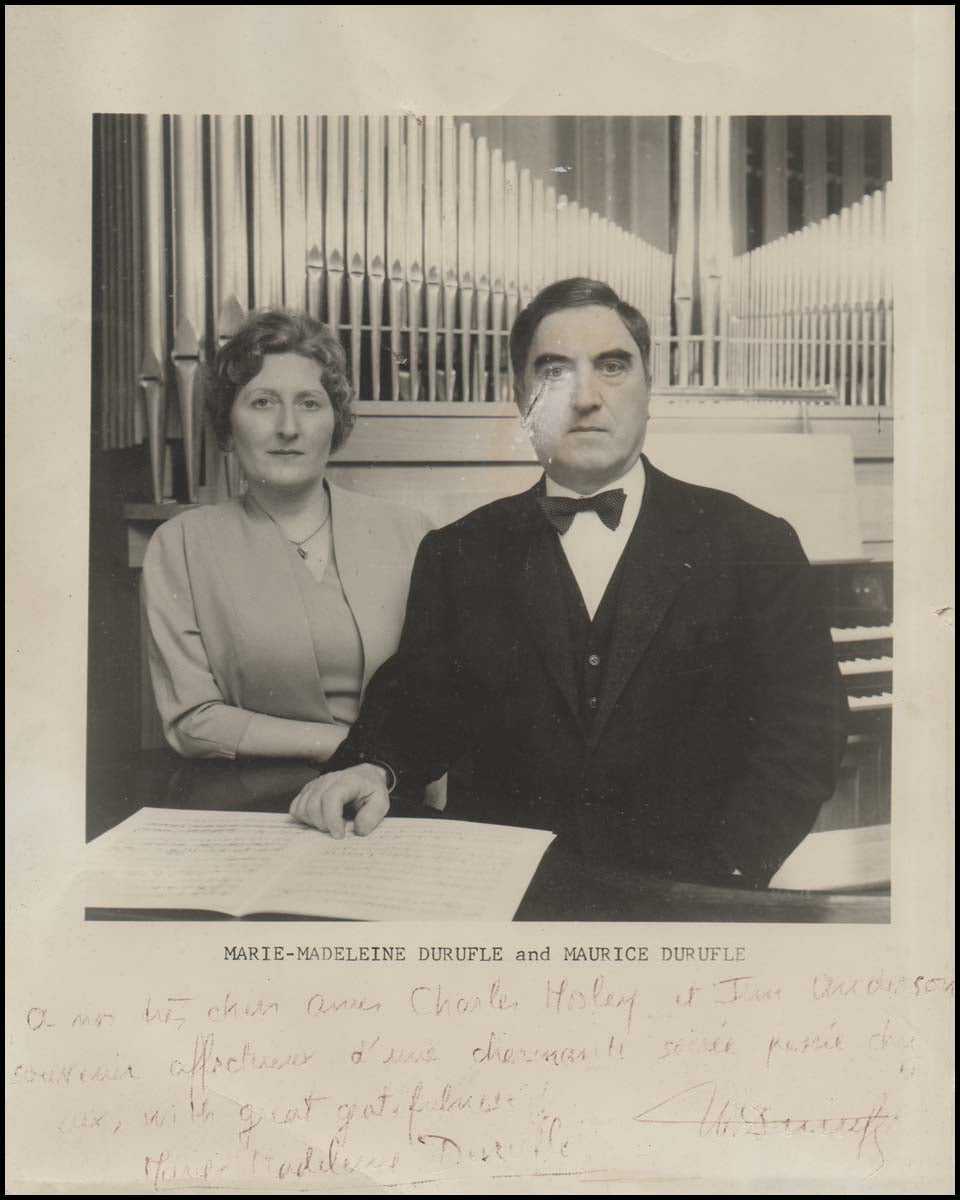 Signed 8 x 10 inch photograph of the French composer, organist, and teacher, a formal portrait in front of an organ, together with Marie-Madeleine Duruflé (née Chevalier), his assistant at St-Étienne-du-Mont who he married in 1953 and with whom he formed a famous and popular organ duo. With a lengthy signed inscription in the hand of Marie-Madeleine ("A nos tres chers amies Charles Mosley et Jun Anderson / souvenir affectuex d'une charmante soirée passée chez eux, with great gratefulness!") and then signed "M. Duruflé." With unfortunate light ink adhesion to the glossy surface, a heavy scratch/blemish to the center of the image,scattered surface and a few heavier creases, small cuts and nicks to the right edge. Nevertheless, these are VERY uncommon signatures in any format!