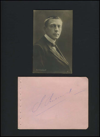 Boldly penned autograph signature “S. Rachmaninoff" on a light pink autograph album page. 15.3 x 11.3 cm. A crisp and very fine example. Together with a vintage postcard portrait photograph.