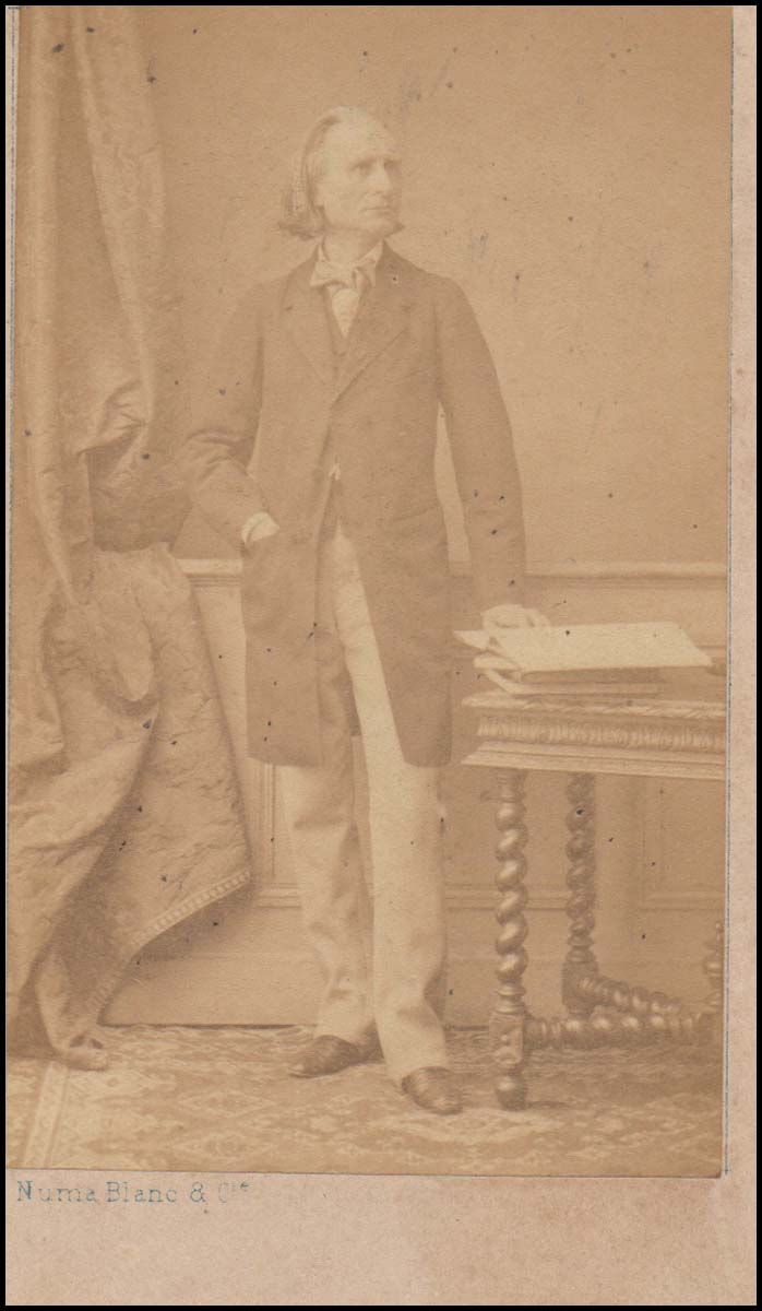 A fine early full-length photograph of the composer, shown beside a curtain, one hand in his pocket, the other resting on a stack of music on a table. 6.5 x 10 cm. By Numa Blanc of Paris, flecked, toned, otherwise very good.