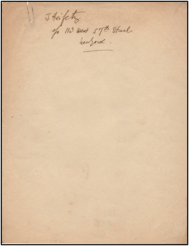 Heifetz, Jascha. (1901–1987). Autograph Signature and Address. The great violinist has signed his name and written the address of his manager (Richard Copley) of the Wolfsohn Bureau on a sheet of paper, "J. Heifetz / c/o 113 West 57th Street / New York." 8.5 x 11 inches. Fine. Unusual!