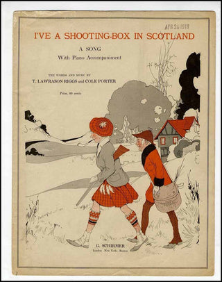 Porter, Cole. (1891–1964). I've A Shooting Box In Scotland. New York: G.Schirmer. 1916. Large format song with lyrics, from Porter's first Broadway show and the first Porter work to be commercially recorded. In good condition with some creasing upper left, partial spine separation repaired inside with thin archival tape.