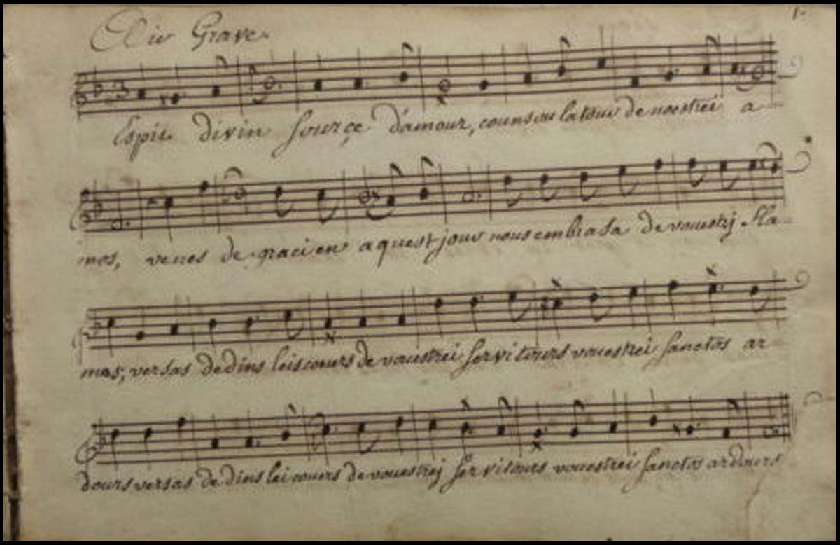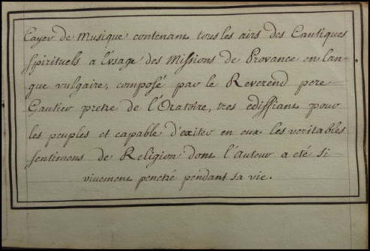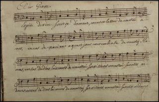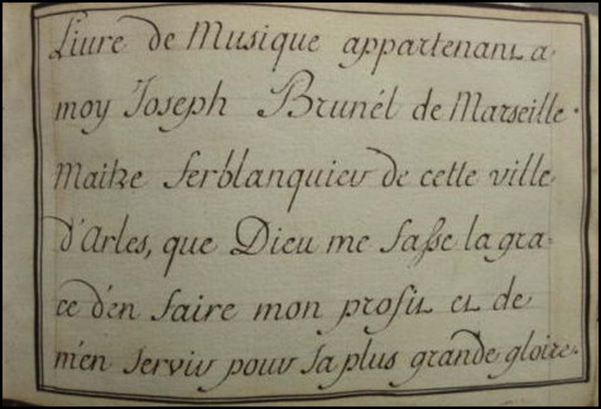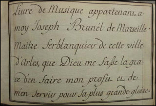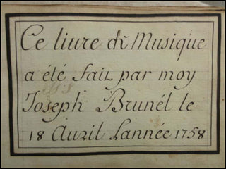 Autograph manuscript. 105 pp. mostly religious music in provençale and old French, title inscribed "ce livre de musique a été fait par moy Joseph Brunel le 18 Avril lannée 1758. Livre de musique apparetnant a moy Joseph Brunel de Marseille, Maitre Serbalanquier de cette ville d'Arles, que Dieu me fasse la grace d'en faire mon profit et de m'en servier pour la plus grande gloire. Cayer de musique contenant tous les airs des Cantiques Sprituels a l'usage des missions de Provance en langue vulgaire, composé par le Reverend pere Gautier pretre de l'Oratoire, tres ediffiant pour le peuples et capable d'exiter en aux les veritables sentiments de Religion dons l'auteur a eté si vivement penetré pendant sa vie." Leather binding, stamped "Recueil." 22 x 14 x 3 cm. Fine.