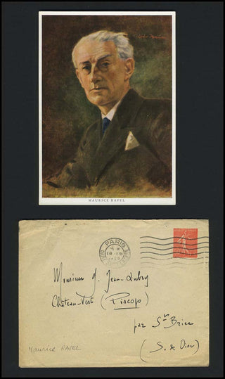 Handwritten 1928 envelope accomplished in the hand of the composer, addressed to G. Jean-Dubry. 15 x 11 cm. Together with a vintage postcard portrait.