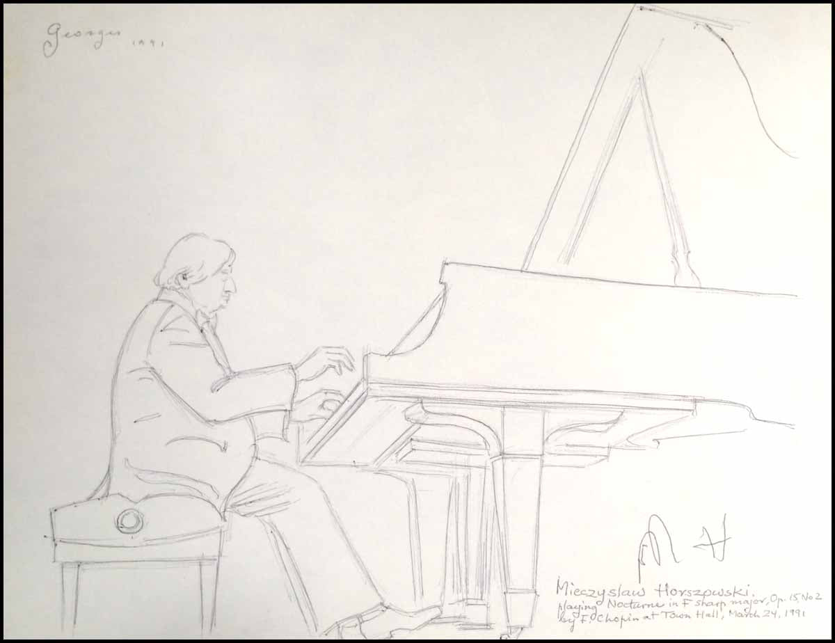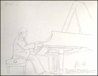 Horszowski, Miecio [Mieczyslaw]. (1892-1993). Signed Portrait. Original, vintage, pen and ink, "on-the-spot" illustration by George 'Georges' Krishizki of the important pianist. The hand drawn illustration has been signed late in life by the pianist with his initials and additionally signed, dated and titled by Krishizki: "Georges / 1991 / Mieczysław Horszowski / Playing Nocturne in F sharp major, Op. 15, No 2 by F. Chopin at Town Hall, March 24, 1991." 9 x 12 on heavy-weight sketch paper, in fine condition with some light overall toning.
