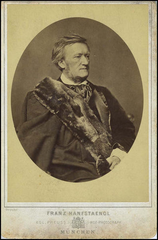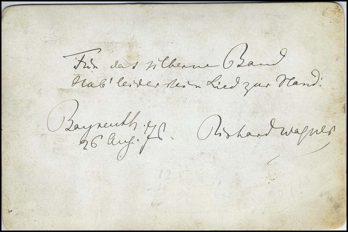 Wagner, Richard. (1813–1883). Signed Photograph with Poem. Franz Hanfstaengl cabinet portrait photograph of the composer, signed and inscribed on the verso on the eve of the third and final Ring Cycle of the historic 1876 Bayreuth season, "Bayreuth, 26. Aug. 76 Richard Wagner" beneath an autograph couplet "Für das silberne Band / hab leider kein Lied zur Hand" ["For the silver ribbon / I sadly don’t have a song available"].