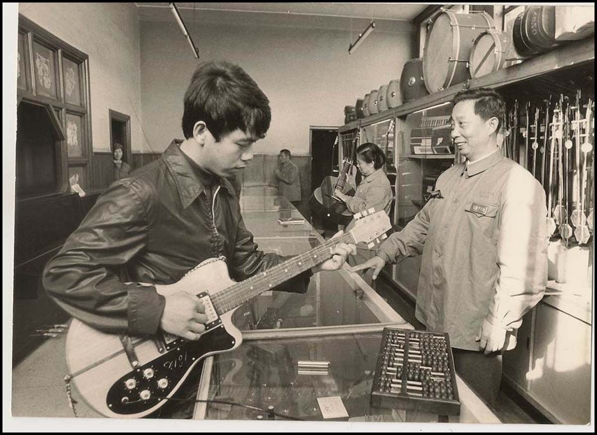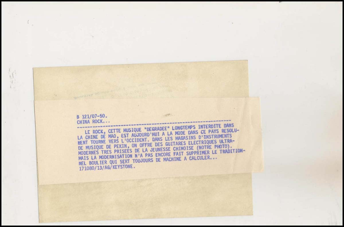 Ca. 1980 original Keystone Press photograph of a young Chinese guitarist in a music shop mostly stocked with traditional instruments but also offering various guitars. 7 inch. x 5 inches. Translated from the French clipping on verso: "Rock, this 'degrading' music long banned in China, is today fashionable as this country resolutely turns westward..."