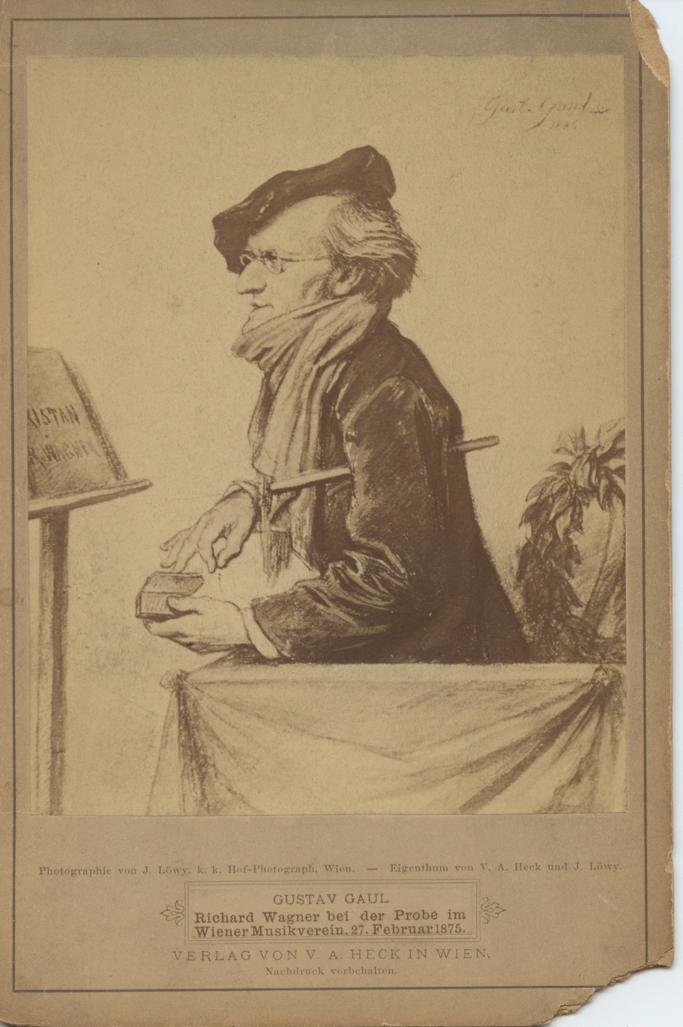 Superb printed caricature by Gustav Gaul, in cabinet card format issued by the Viennese firm V.A. Heck. The caption identifies the scene as "Richard Wagner bei der Probe im Wiener Musikverein, 27 February 1875." 4.5 x 6.5 inches (11.3 x 17 cm), small chips to upper and lower right corners, otherwise good condition.
