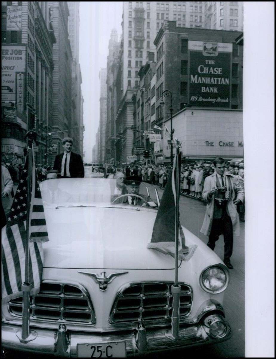 Vintage Paris Match photograph of the American pianist who won worldwide recognition in 1958 after winning the first International Tchaikovsky Piano Competition in Moscow, at the height of the Cold War. He is shown standing in the back of a convertible as he rides through the streets of NY greeted by thousands of adoring fans following his Moscow triumph. In fine condition, a remarkable image. 7.25 x 9.5 inches.