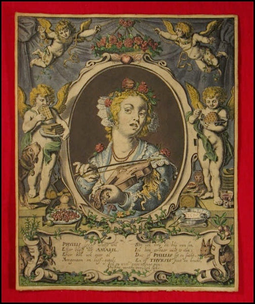 [Music Iconography] Matham, Jacob. (1571-1631). Phyllis Playing the Violin. Amsterdam: 1622. A very good hand-colored impression of this work by Adriaan van de Venne (1589-1662), engraved by Matham. Full plate border, on a sheet with Dutch text beneath and on the verso, 17 x 21 cm.