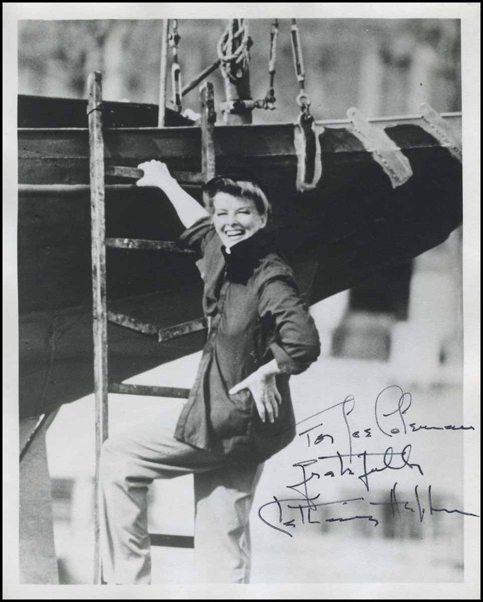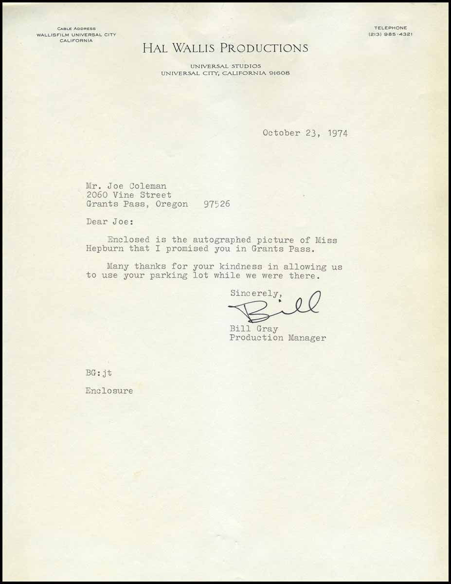 Signed 8 x 10 inch photograph of the actress sent as a gift to Joe Coleman, who allowed filming of a scene on one of his properties for the Heburn/John Wayne film "Rooster Cogburn" in 1975. Together with a letter from the film's production manager, Bill Gray, and the original envelope from Universal Studios.