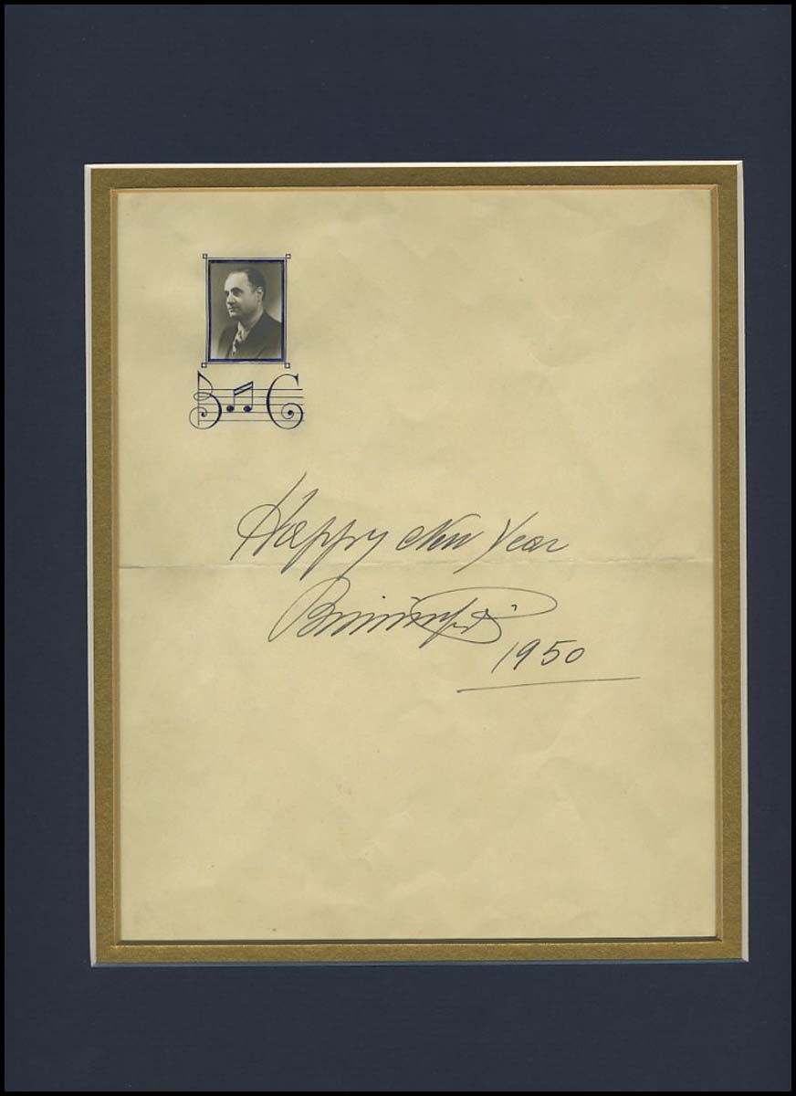 Autograph greeting "Happy New Year / Beniamino Gigli / 1950" from the honey-voiced tenor. On an 8vo sheet of his personal letterhead bearing his initials and a small inset real photograph, nicely matted to 11.5 x 13.5 inches overall.