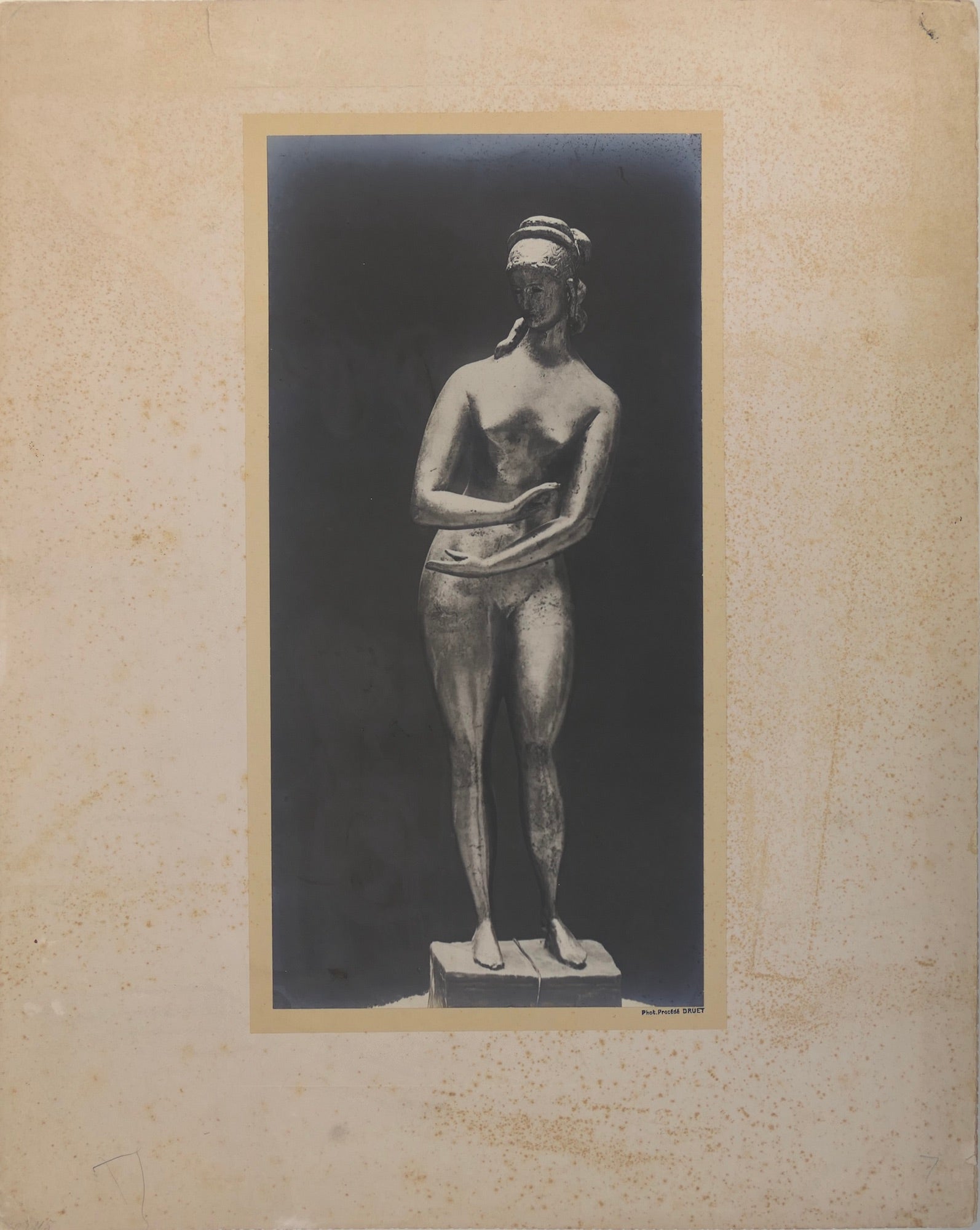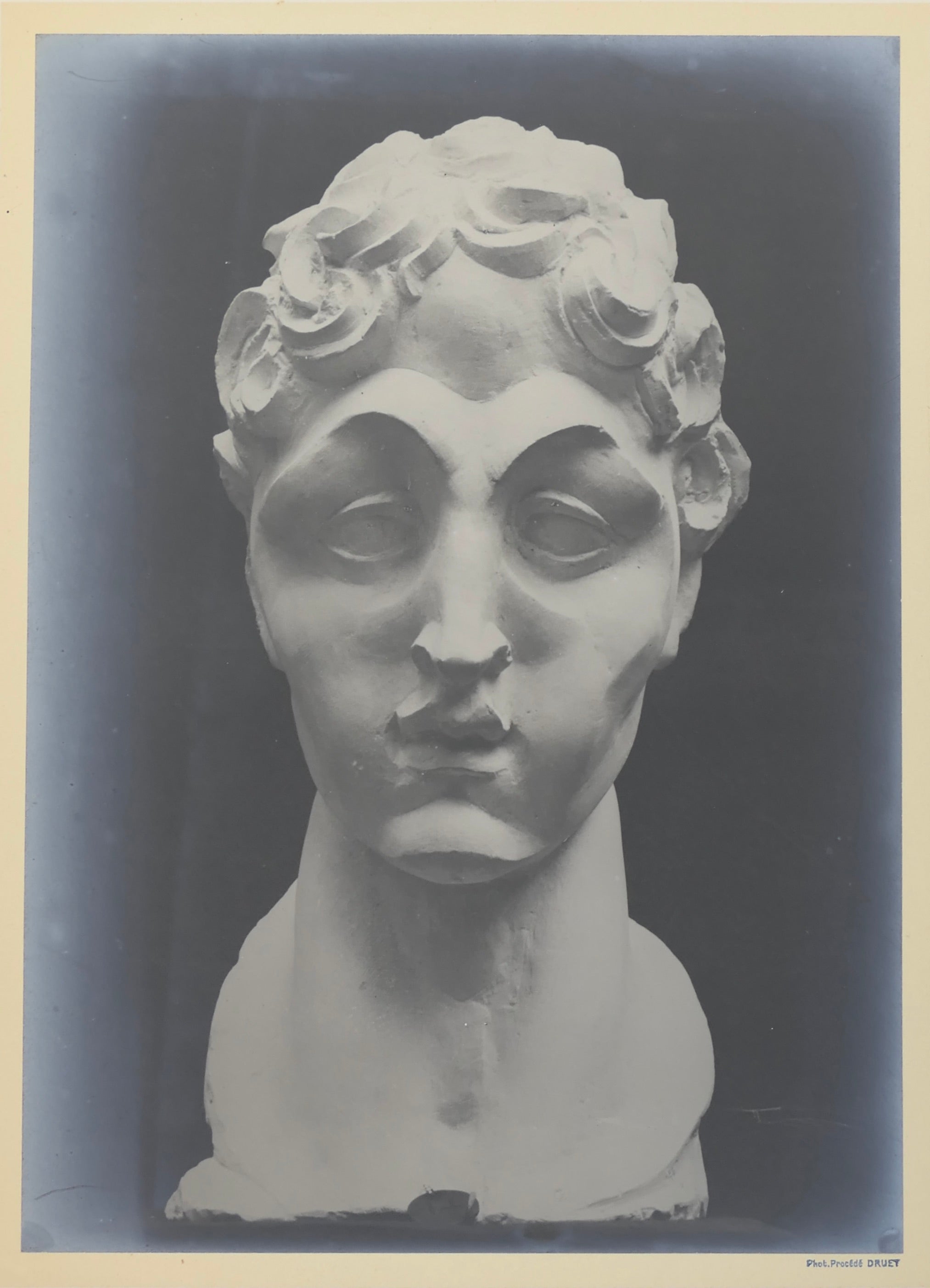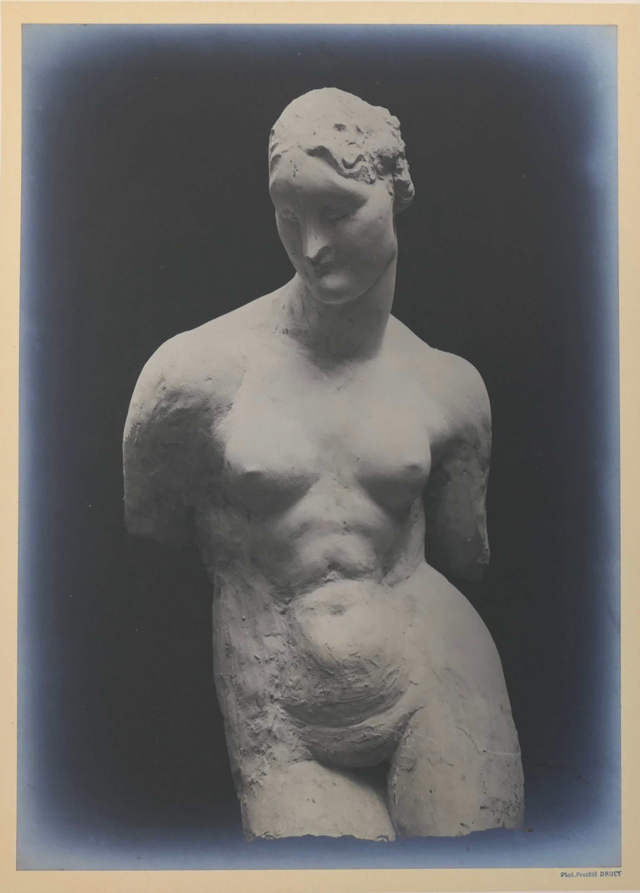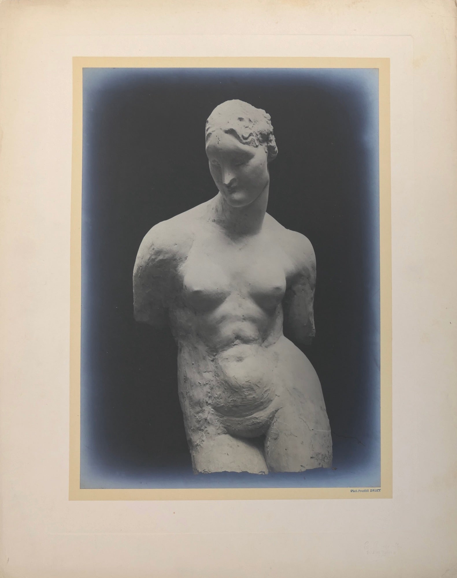 Group of eight vintage silver gelatin exhibition photographs of Elie Nadelman sculptures, approx. 1908 -09, each roughly 15 x 10 inches (38 x 25.5 cm), taken by the photographer and gallerist Eugène Druet on the occasion of Nadelman's first ever solo exhibition, Galerie Druet, Paris, 1909. Some of the original exhibited plaster works were destroyed and these remarkable photographs (other examples of which are in the Lincoln Kirstein Photograph Collection, Jerome Robbins Dance Division, New York Public Library), constitute thus the only record of some of the works included in this historic exhibition. Each stamped "Phot. Procédé DRUET" in blue to the inner mount and with the drystamp "E. Druet / 20, Rue Royale / Paris" lower right. Generally in fine condition, with some silvering and scattered foxing to the mounts, two with losses to the mounts.