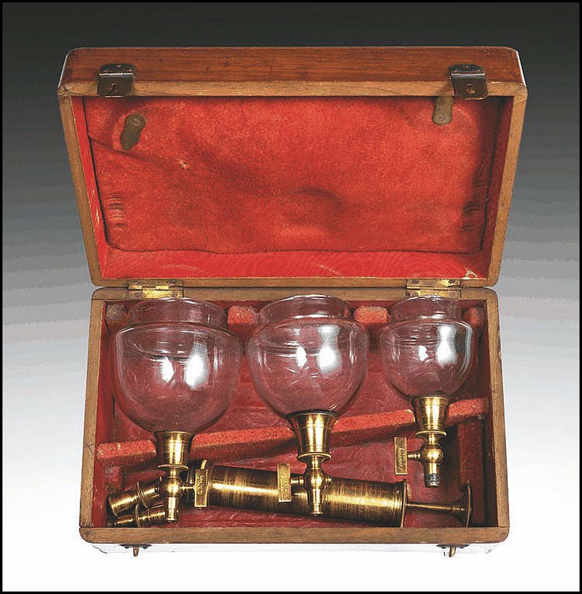 Paganini, Nicolò. (1782–1840). The Personal Bloodletting Set of Paganini. A most macabre relic, being the bloodletting set formerly owned and used by the Italian violinist, violist, guitarist, and composer, the most celebrated violin virtuoso of his time and one the most colorful musical figures of the Romantic era. French, ca. 1820, consisting of three domed-shape glasses with a brass twist spouts and a scarification tool of brass, contained in a fitted walnut box measuring 22 x 14 x 9.5 cm. Stamped "Chappiere a Paris," possibly lacking a piece or two, but otherwise in fine condition.