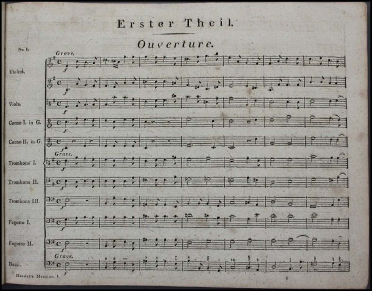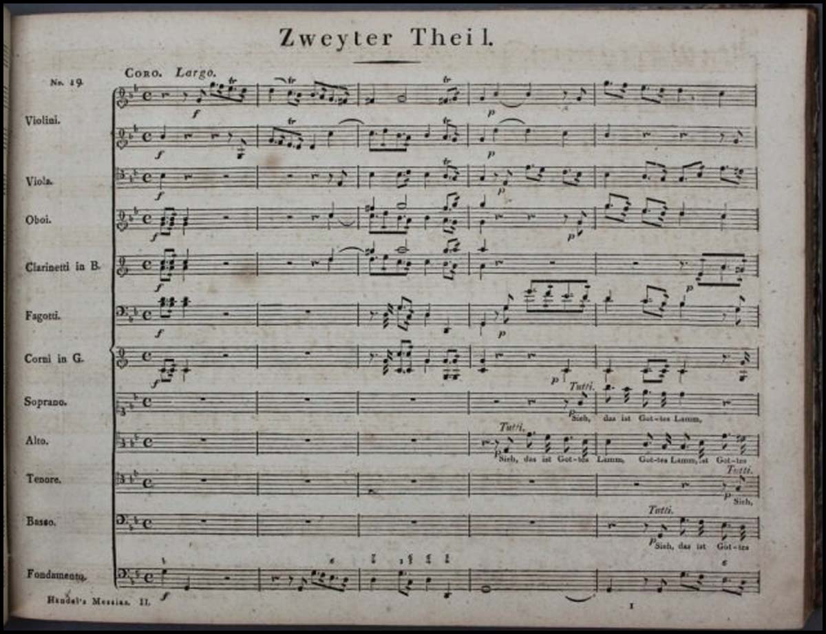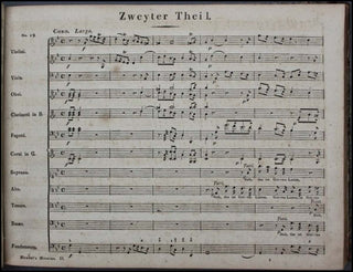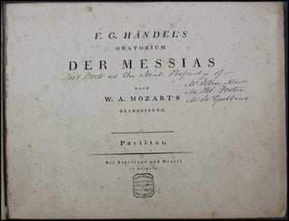 [Handel, George Frederic. (1685–1759)] Mozart, Wolfgang Amadeus. (1756–1791). Händel's Oratorium Der Messias nach W. A. Mozart's Bearbeitung.. Leipzig: Breitkopf & Hartel. [1803]. First printing. Three parts bound as one: Erster Theil (108 pp); Zweyter Theil (96 pp); Dritter Theil (48 pp). Oblong quarto. Contemporary marbled boards, front hinge weak. Internally in very fine condition, ownernship signature on title. First edition of the full score of Mozart's re-orchestration of Handel's Messiah, fully engraved. Köchel 572.