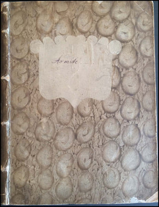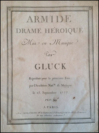 Gluck, Cristoph Willibald. (1714–1787). ARMIDE: Drame Héroique Mia en Musique...Representée… par l’Academie Nat. de Musique le 23 Septembre 1777. . Paris: Chez Des Lauriers. [1790]. Full score, upright folio. Engraved title, [blank verso], [engraved “Catalogue…” page], [blank verso], I-279 pp, complete. Front cover with manuscript title plate. Hand-painted wrappers over spine with 4 raised bands. A generally clean and crisp copy, including the Des Lauriers catalogue of publications on the second leaf, the columns including 29/30 works. Hirsh, II, 268; Hopkinson 45A (f), an unrecorded third edition variant printed from the plates of the first edition, but not specified by Hopkinson (30 works listed as opposed to 31 in the right catalogue column).