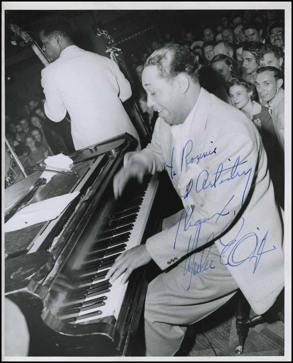 A striking and unusual signed image of the important American jazz composer, bandleader and pianist who remains the most significant composer of the genre. 8 x 10 inch photograph of Ellington in full action at the keyboard behind a bass player and with a crowd of fans looking towards him. Likely an unpublished image, boldly signed and inscribed "To Ronnie, Good Artistry Thanx, Duke Ellington." Some light wear around the edges. Overall good condition.