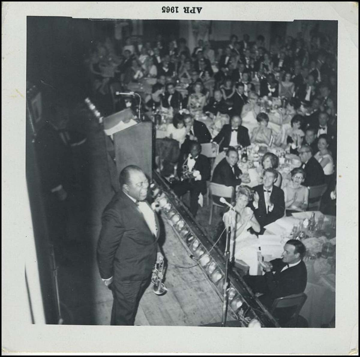 Original candid snapshot photograph dated April, 1965. Approximately 3.5 x 3.5 inches in size. In very good condition. Likely an unpublished image of Satchmo performing.
