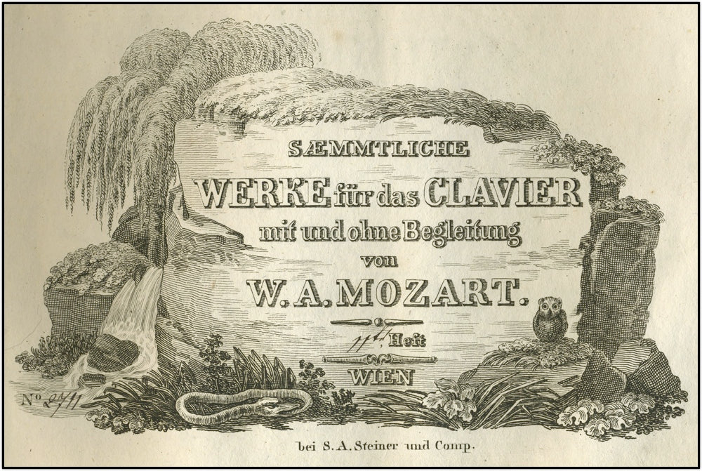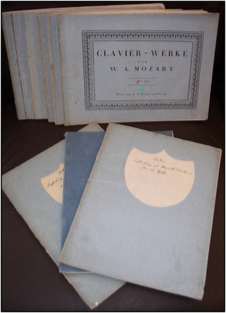 Mozart, Wolfgang Amadeus. (1756–1791). Saemmtliche Werke für das Clavier, mit und ohne Begleitung... Sonaten für das Piano-Forte... 9, 10, 11, 12, 13, 14 Heft.. (Sonatas for Violin and Piano)Vienna: Steiner und Comp. . [1818]. First edition. Oblong 4to. Volumes 9 - 14 Clavier; volumes 7-14 Violin. [PN] (2708, 2708 violin only) 2709, 2710, 2711, 2712, 2713, 2714. Each piano volume bearing the rare illustrated title vignette and the full title page. All volumes in original grey-blue wraps with stamped greek freeze, all in fine condition.